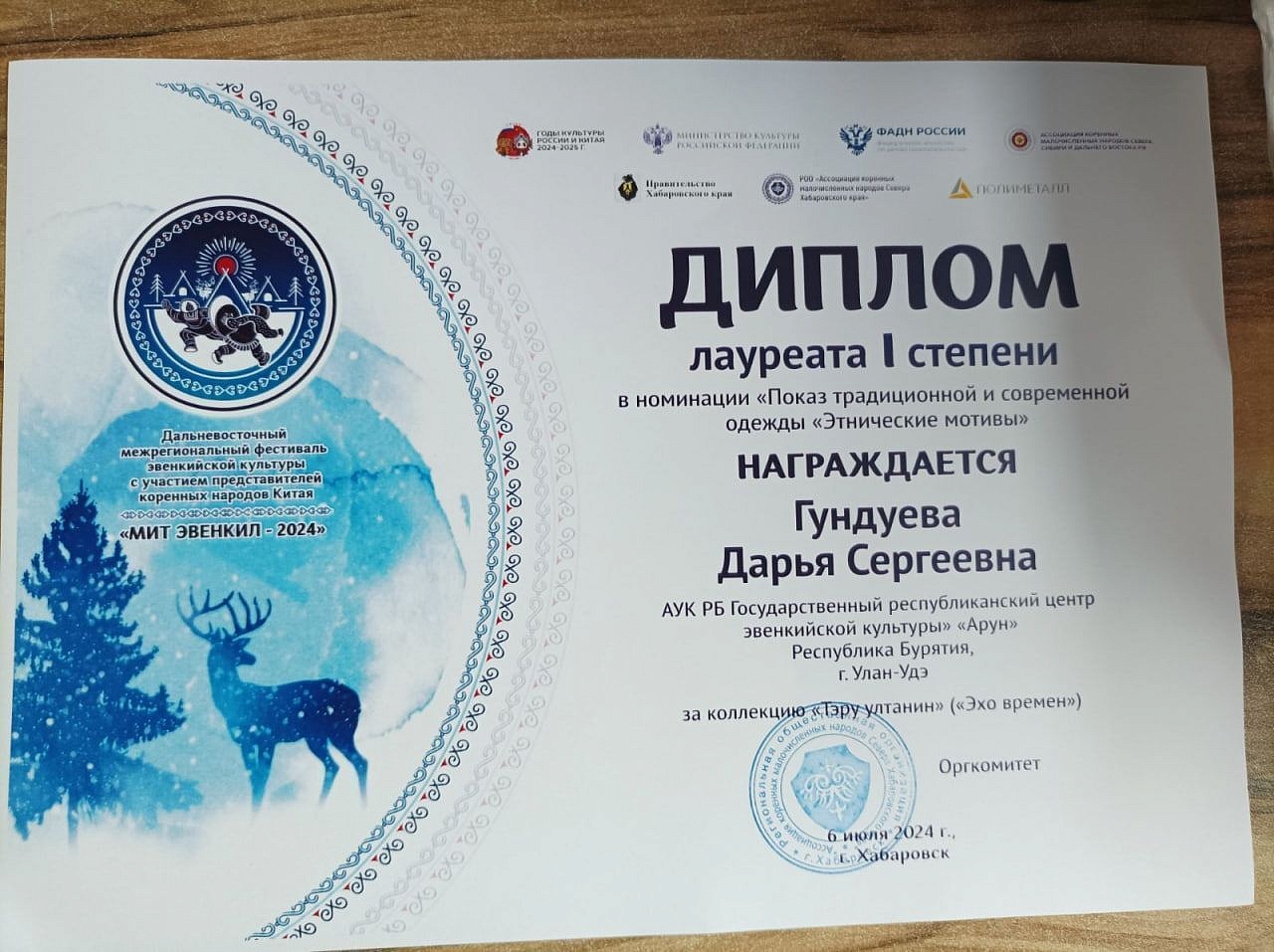Кроме того, диплом лауреата I степени получила мастер декоративно-прикладного искусства центра «Арун» Дарья Гундуева – в номинации «Показ традиционной одежды «Этнические мотивы» за показ коллекции костюмов «Тэру ултанин» («Эхо времён»). В номинации современная, стилизованная одежда первое место также у Бурятии. Его присудили Надежде Шеметовой за коллекцию «Омакта тыманни».