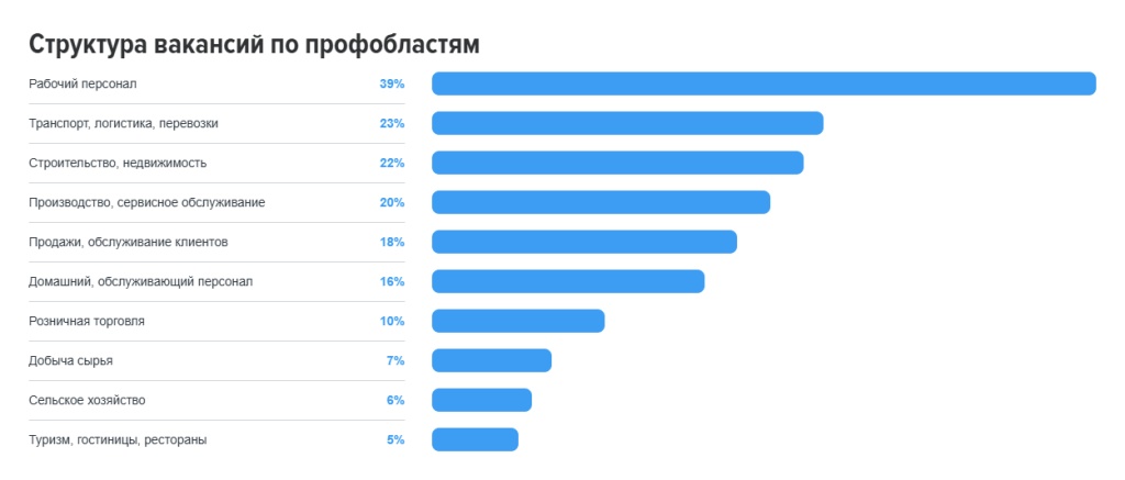 По итогам ноября в Бурятии открыто 4,9 тысячи вакансий. При этом больше всего работодатели нуждаются сейчас в специалистах из сфер «Рабочий персонал» (39% от всех активных предложений о работе в регионе), «Транспорт, логистика, перевозки» (23%), «Строительство, недвижимость» (22%), «Производство, сервисное обслуживание» (20%), «Продажи, обслуживание клиентов» (18%), «Домашний, обслуживающий персонал» (16%), «Розничная торговля» (10%), «Добыча сырья» (7%), «Сельское хозяйство» (6%), «Туризм, гостиницы, рестораны» (5%). – см. график ниже