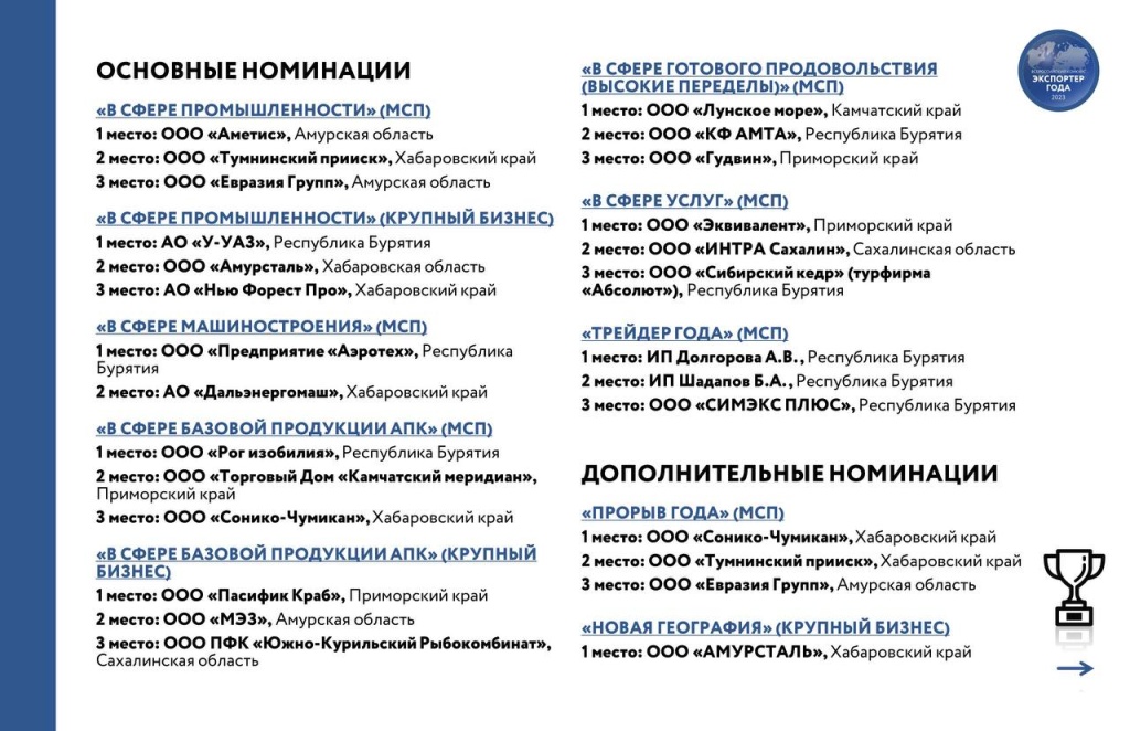 Лидерами округа по экспортным результатам стали Республика Бурятия, Приморский и Хабаровский края. Компании из этих субъектов заняли больше всего призовых мест: 13, 11 и 9 соответственно.