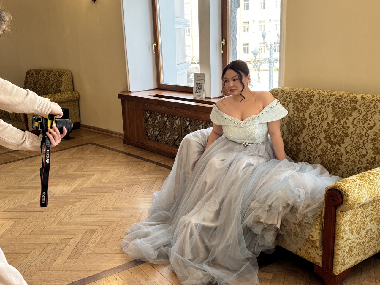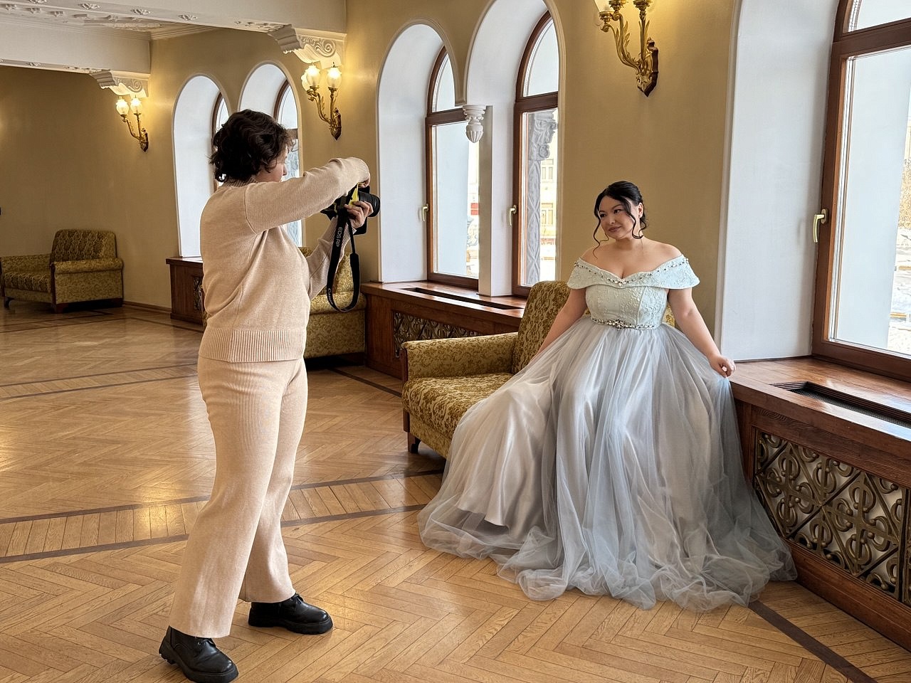 Фотосессия проходит в фойе театра и на его знаменитых лестницах. Каждый участник или участница примерит на себя королевскую грацию, а театральный фотограф Анна Арапова поможет поймать лучшие моменты. Также бесплатно можно подобрать театральные аксессуары: короны, перчатки, накидки и украшения. Это детали, которые подчеркнут красоту и помогут создать королевский стиль.