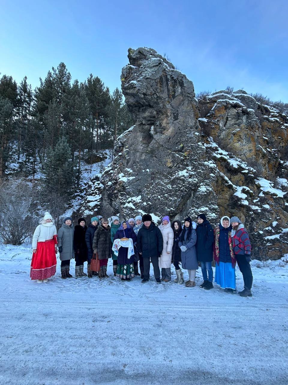 - Гостей встречаем хлебом-солью в русских костюмах в местности «Подкамень». Возле него проходит дорога, создаётся впечатление, что глыба камня как бы падает с горы. Здесь проходит знакомство, фотосессия с красотами природы. Затем экскурсию в клубе проводит Марина Ильинична. Показывает выставку, посвящённую СВО. Здесь организован пошив вещей для воинов. Затем все проходят к памятнику «Воинам землякам – участникам Великой Отечественной войны». Рядом желающие посещают церковь Во имя Святого Духа. Все заходят в церковь, не зависимо от вероисповедания, ставят свечи за погибших.