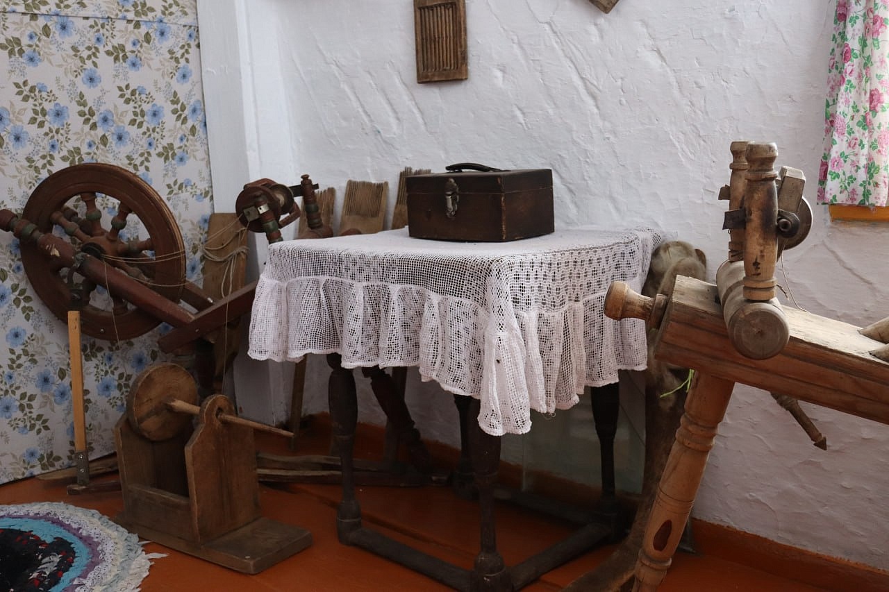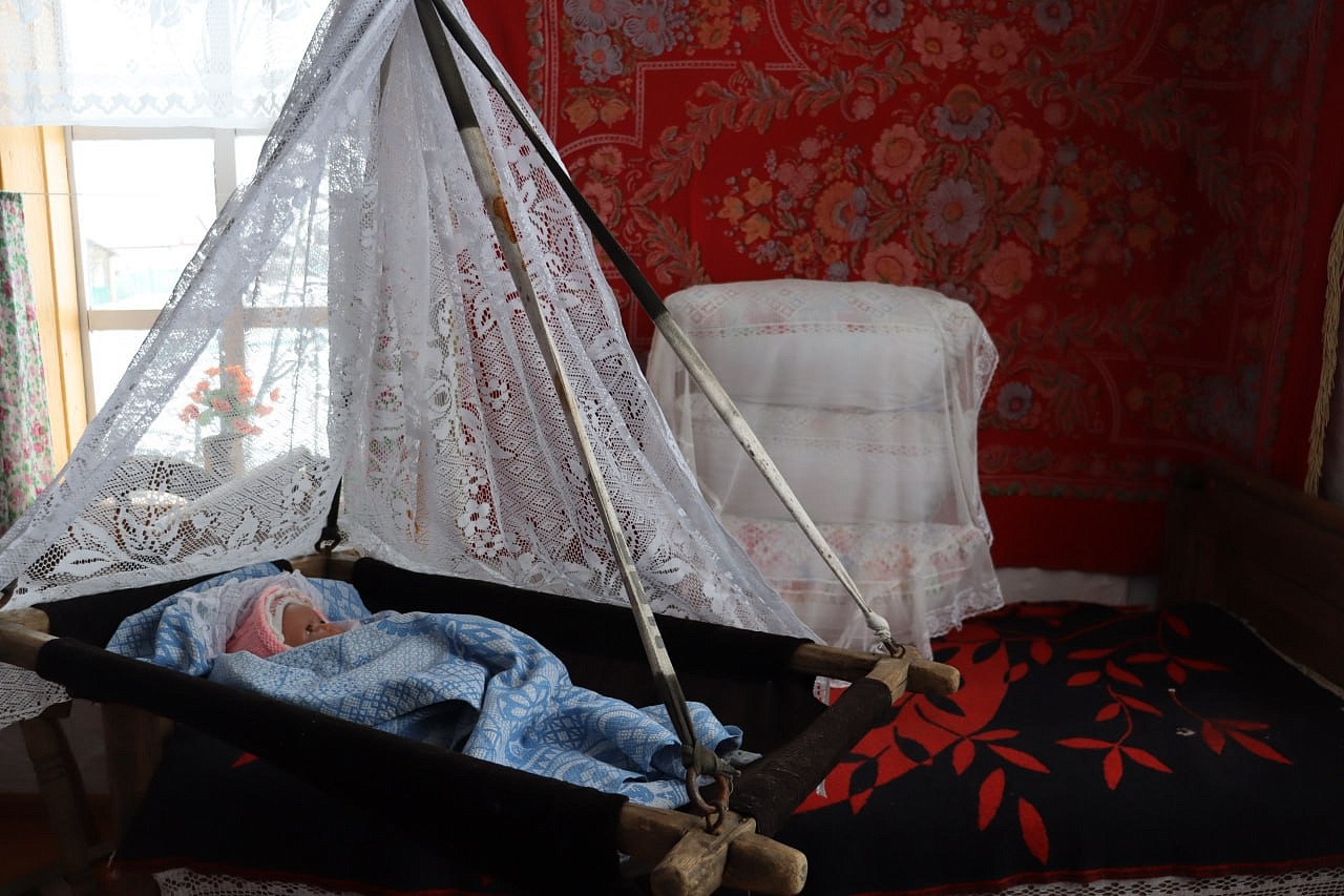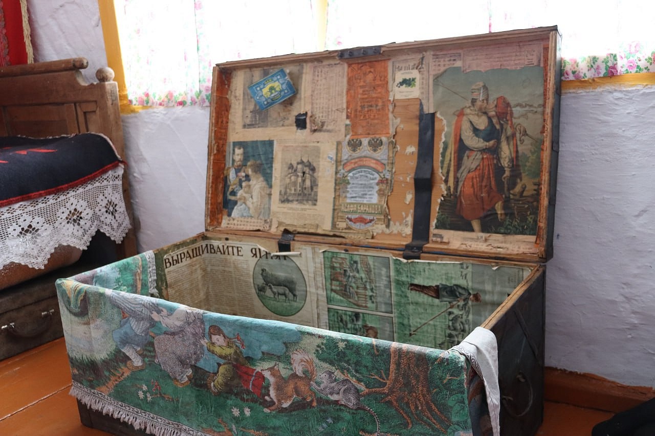 На старой деревянной кровати с набалдашниками — кружевная накидашка на подушках и свисает узорчатая, связанная крючком простынь под покрывалом. На стенах незатейливые ковры, на полу домотканные дорожки. Старинные фото размещены в рамках на стене. На белёных стенах (без штукатурки ещё) висят вышивки, вышитые крестиком, как было модно в 50-60-е годы. В углу висит икона Богородицы. Впечатляют жернова каменные, на которых мололи зерно. Прялки разных модификаций и размеров, на которых по вечерам пряли русские женщины. Кадки, сельницы и лопаты для хлеба. Сельницы выдолблены из целого куска дерева.