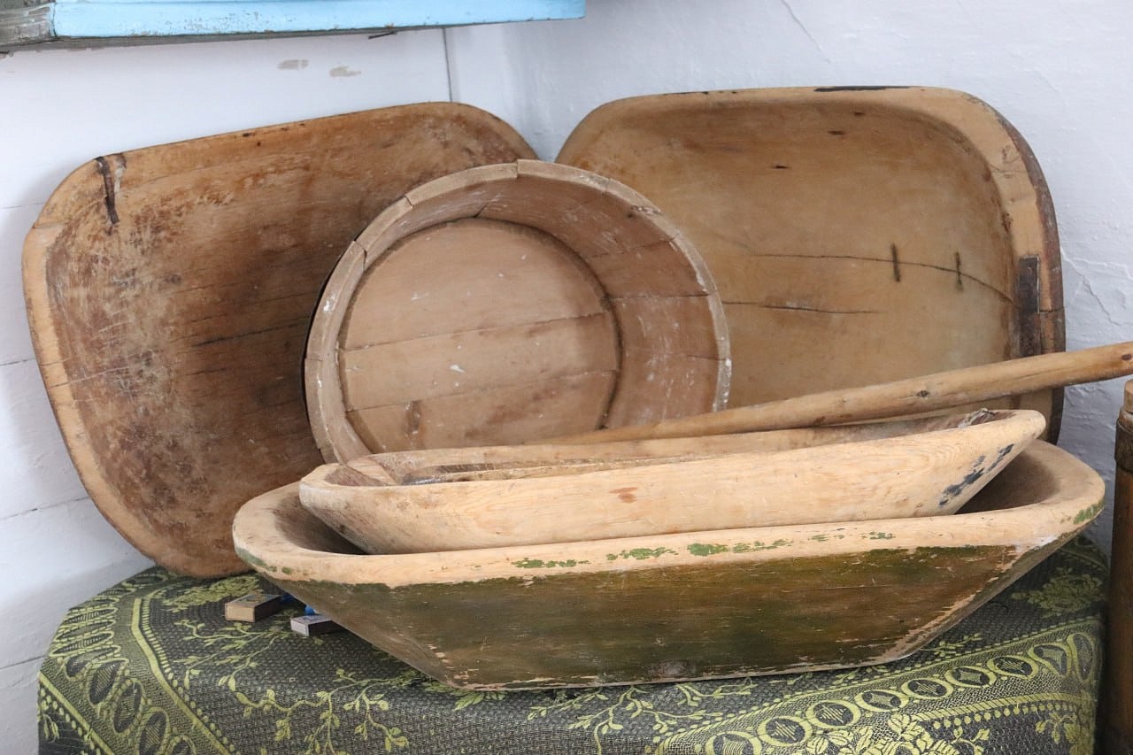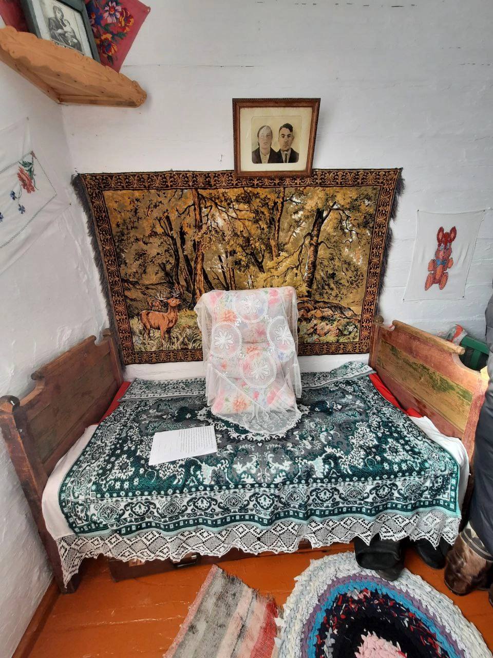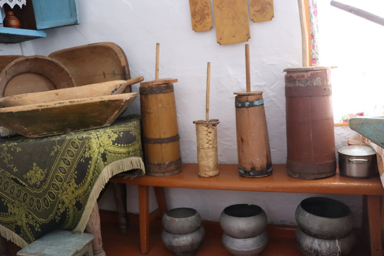 На старой деревянной кровати с набалдашниками — кружевная накидашка на подушках и свисает узорчатая, связанная крючком простынь под покрывалом. На стенах незатейливые ковры, на полу домотканные дорожки. Старинные фото размещены в рамках на стене. На белёных стенах (без штукатурки ещё) висят вышивки, вышитые крестиком, как было модно в 50-60-е годы. В углу висит икона Богородицы. Впечатляют жернова каменные, на которых мололи зерно. Прялки разных модификаций и размеров, на которых по вечерам пряли русские женщины. Кадки, сельницы и лопаты для хлеба. Сельницы выдолблены из целого куска дерева.