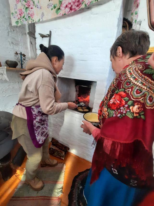 После начинается самое главное - посещение музея деревенского быта «Деревенская изба». Здесь рассказывает Альбина Александровна, начиная с сеней. Деревенская изба большая, в ней несколько экспозиций. Гостей знакомят с бытом предков, показывают предметы, для чего они использовались и как. В это время топится русская печка. Организаторы показывают, как заводить тесто и печь оладушки на углях. Это своеобразный мастер-класс. Гости вовлекаются в процесс охотно, сами стряпают оладьи. Тут же кипит самовар с углями внутри. Все с удовольствием пробуют горячие оладьи.