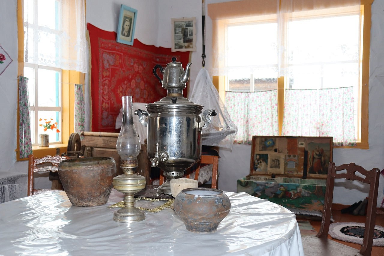 Надо только представить, каких размеров были эти деревья! Здесь сундуки, есть один больших размеров с картинками старинными. На одной из них император с женой и ребёнком. Лавка резная возле стены, стулья с резными спинками возле огромного круглого стола с большим самоваром. Трюмо такое старое, что зеркала немного потускнели. В зыбке и кроватке спят куклы — детки хозяев избы. На другом столе лежат две стопы журналов, тогда ещё выписывали журналы и читали их. Сверху журнал «Загадки истории» с надписью: «Что ждёт Россию в XXI веке. Пророчества Нострадамуса». Много ещё можно перечислять, что собрано в музее быта. Здесь и большая русская печь с лежанкой наверху. Две печи русских сделали на средства ТОСа. В плане — построить небольшой сарайчик для сельскохозяйственной утвари.
