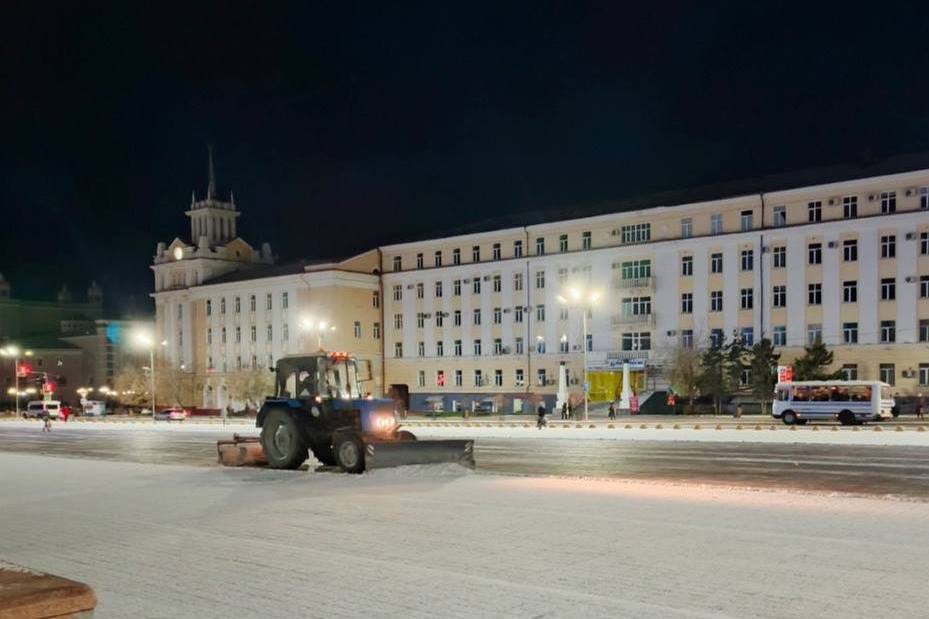 В связи с выпавшим снегом в Улан-Удэ сотрудники Комбината по благоустройству с 4:30 утра убирают улицы и подсыпают дороги.