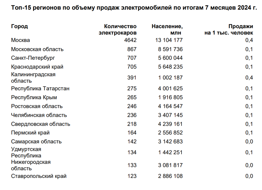 В абсолютном выражении первое место по продажам электрокаров* тоже занимает столица. По итогам семи месяцев 2024 года в Москве было зарегистрировано более 4,6 тысячи новых машин с электродвигателем. На втором месте с заметным отрывом от лидера – Московская область (867 ед.). Третий результат демонстрирует Санкт-Петербург, жители которого приобрели за январь-июль 707 электромобилей. Топ-5 самых крупных рынков сбыта новых «электричек» дополняют Краснодарский край (705 авто) и Калининградская область (391 ед.).