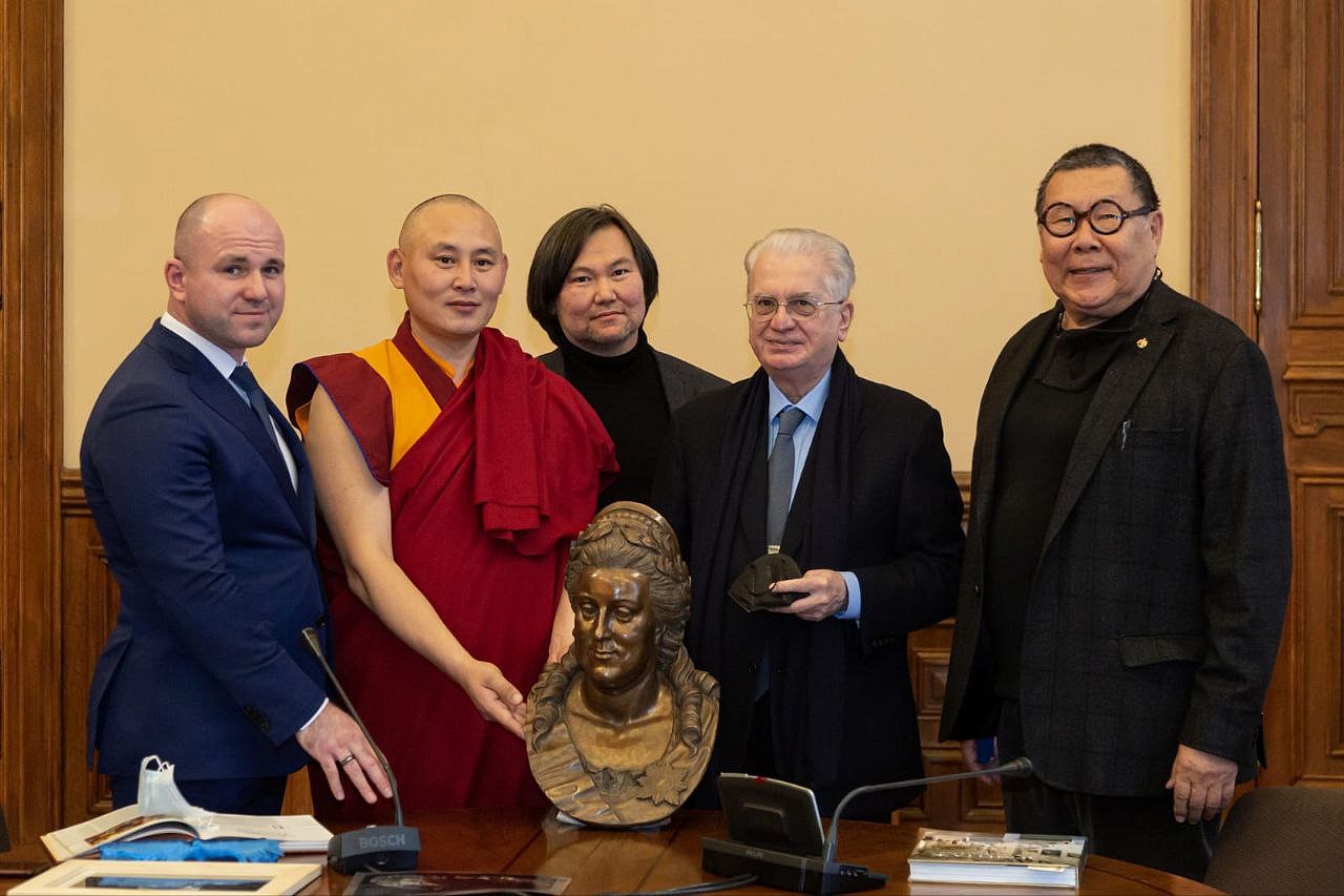 А началась совместная деятельность и дружба Вячеслава Борисовича Бухаева и Центра «ЗОВ ЗЕМЛИ» с другого исторического для жизни двух регионов по сегодняшним меркам события. 19 октября 2021 года в дар Государственному Эрмитажу была преподнесена точная копия бюста Екатерины Великой из Анинского дацана. Копия, того самого бюста, который стоял на алтаре Анинского дацана, вплоть до 1917 года. В передаче бюста в Эрмитаж тогда участвовали авторы – Вячеслав Бухаев и Матвей Макушин, Ширээтэ-лама Анинского дацана Лекцог-лама Дарижапов и заместитель главы МО «Георгиевский», представитель Центра «ЗОВ ЗЕМЛИ» Константин Балаганский.