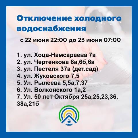 В ночь с 22 по 23 июня будет произведено отключение холодного водоснабжения по нескольким адресам в Железнодорожном районе города, сообщает МУП «Водоканал».