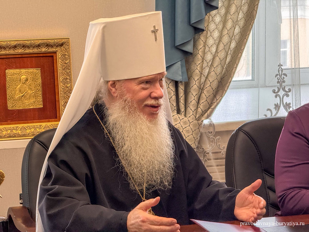 На встрече присутствовали секретарь Улан-Удэнской и Бурятской епархии иеромонах Тихон (Тихомиров) и член Общественной палаты Республики Бурятия иерей Роман Хлыбов.