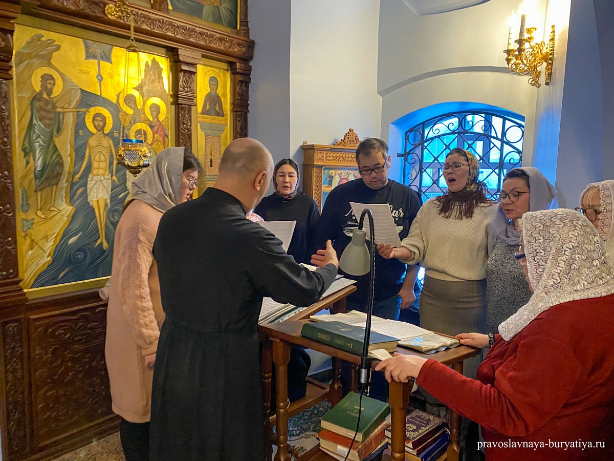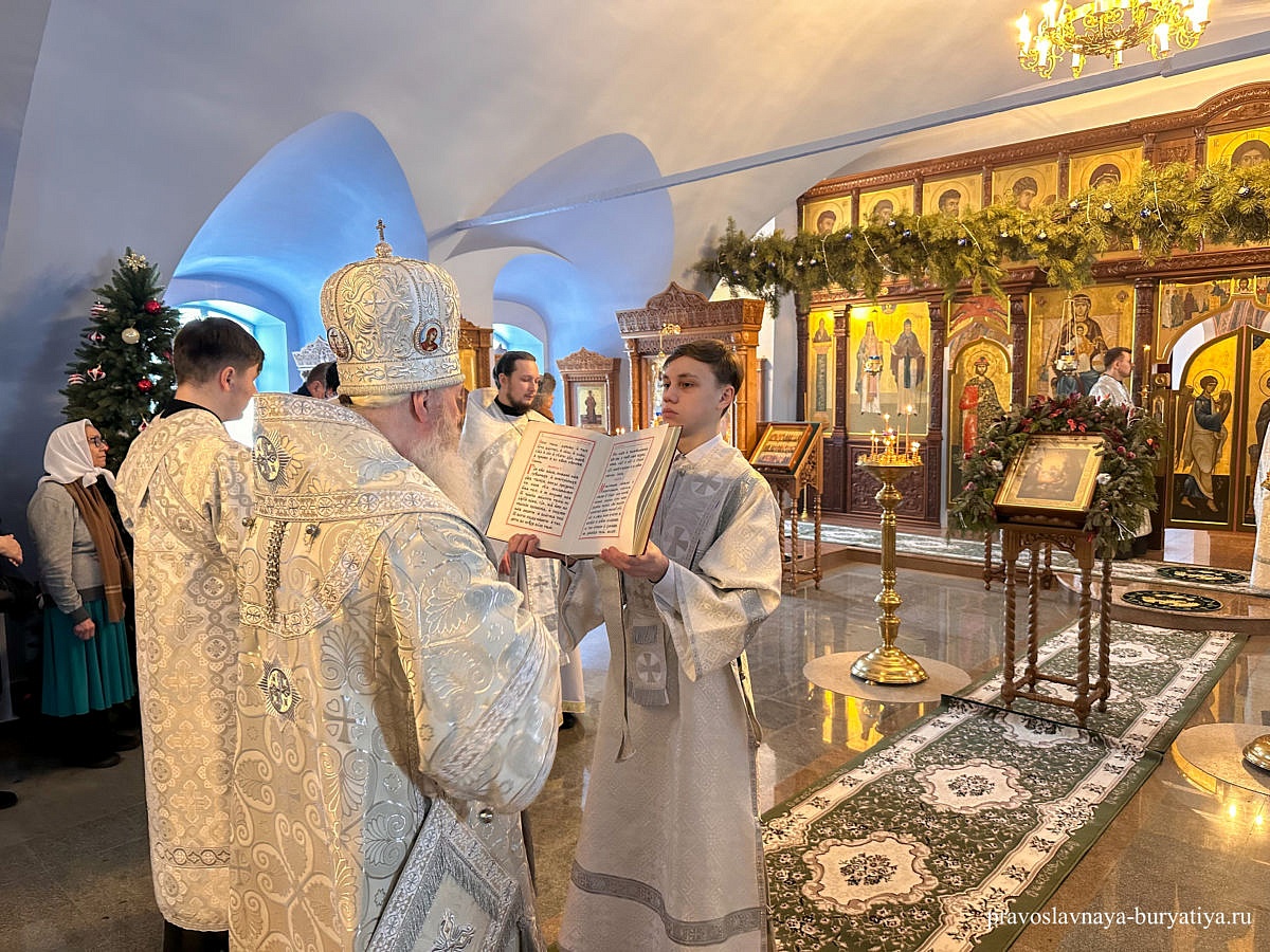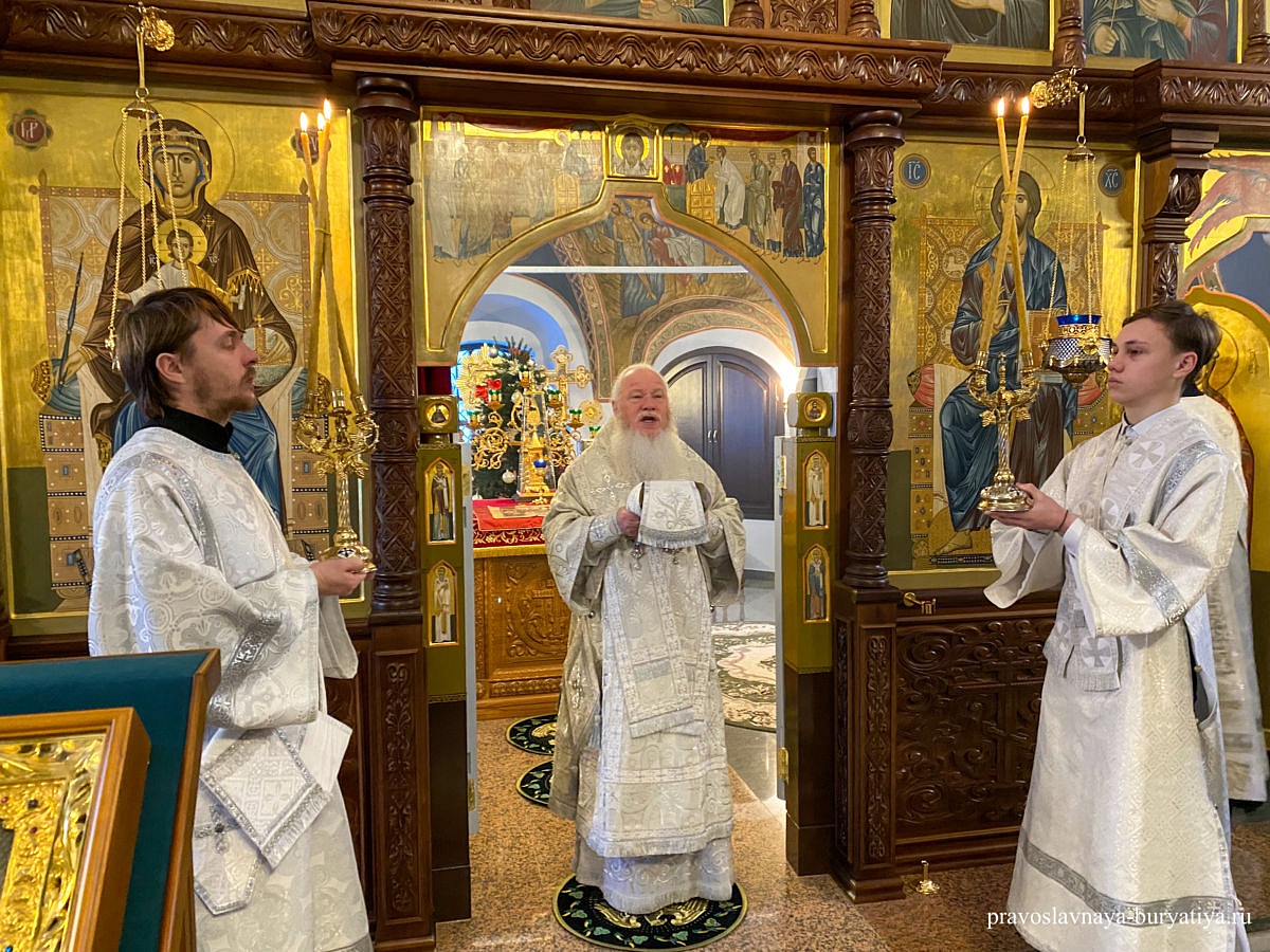 Владыке сослужил секретарь Улан-Удэнской и Бурятской епархии - иеромонах Тихон (Тихомиров) и соборные клирики.