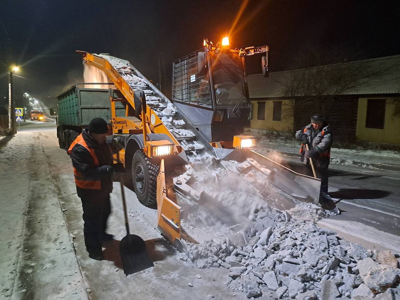 Накануне ночью два больших комплекса очистили участки дорог на улицах Смолина, Медицинская, Красной Звезды. Такие комплексы сразу убирают снежные накаты с проезжей части, загружает снег в большегрузные машины и вывозят на специальные места временного складирования. В трех районах города также работали грейдера, трактора-щетки и мини-трактора.