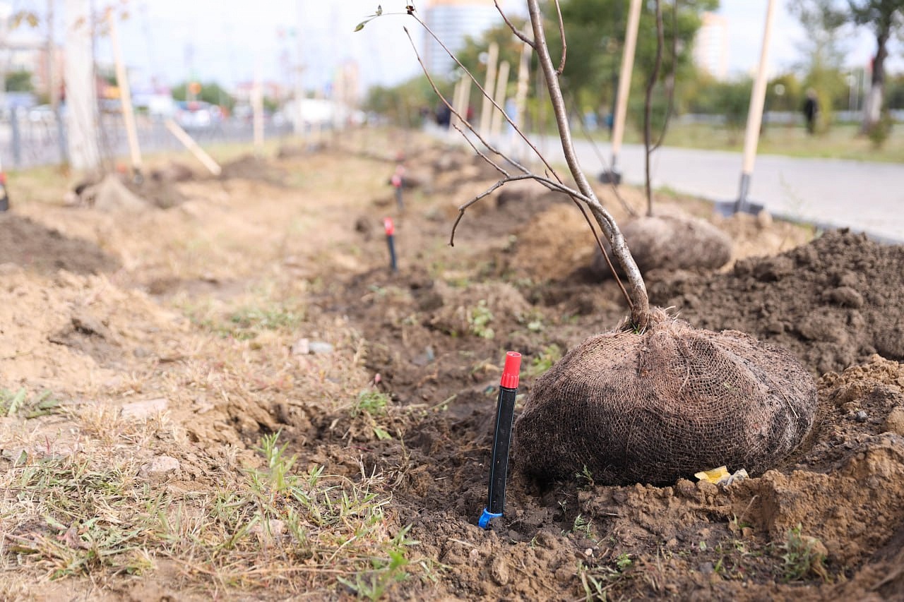 Все саженцы от 2 м, чтобы прижились на новом месте. Здесь на участках под будущий газон внесут плодородный грунт, а весной посеят газон. На протяжении всей улицы обустроен автоматический водополив.