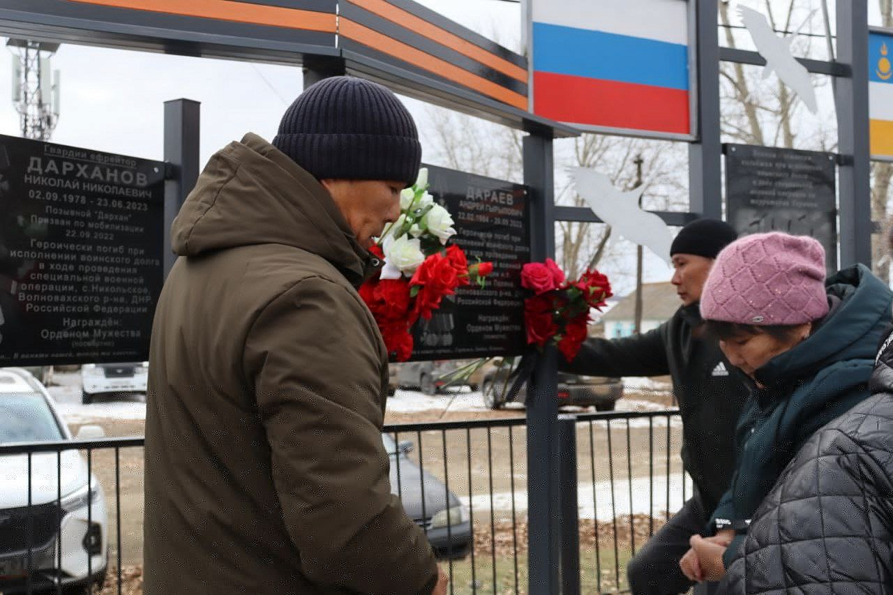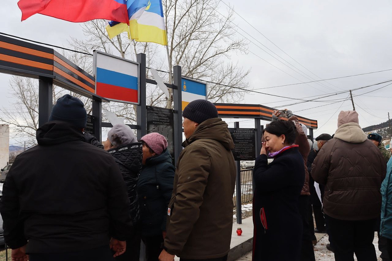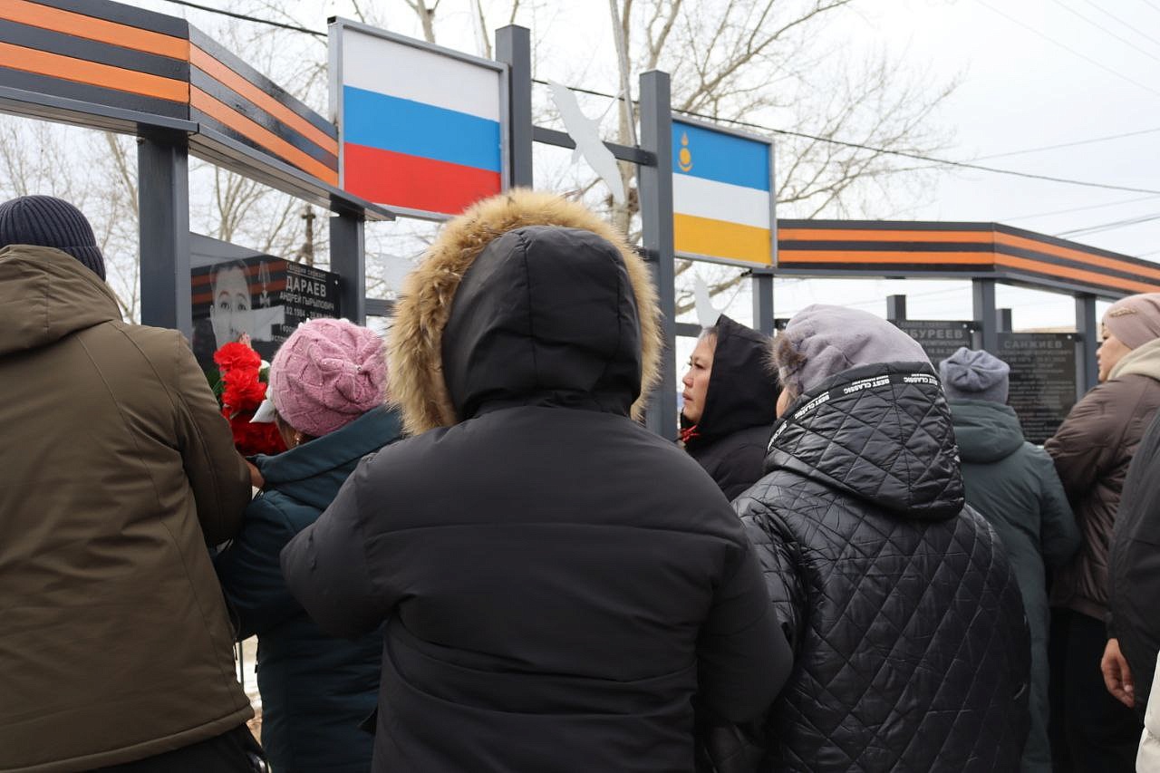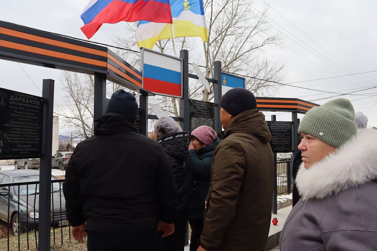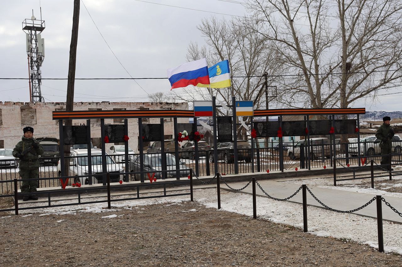 На мемориальных досках запечатлены воины с наградами, все они награждены посмертно орденом Мужества. Слава героям Отечества: военнослужащим: Виктору Цыремпиловичу Тулбурееву, Андрею Гырыловичу Дараеву, Дмитрию Михайловичу Очирову, мобилизованным: Александру Борисовичу Санжиеву, Николаю Николаевичу Дарханову, Денису Михайловичу Рычкову, добровольцам: Виктору Александровичу Рычкову, Андрею Юрьевичу Цыренжапову. Виктор Рычков с позывным «Витязь» пошёл добровольцем, чтобы найти брата, мобилизованного Москвитина Павла Анатольевича, пропавшего без вести в горниле войны, но сам погиб через 3 месяца смертью храбрых в посёлке Урожайном. На его памятной доске надпись: «Мы жертвовать готовы жизнью, хотя она нам раз дана, храните, юноши, Отчизну, она у нас, как мать, одна!». У Виктора Рычкова остались 3 детей.