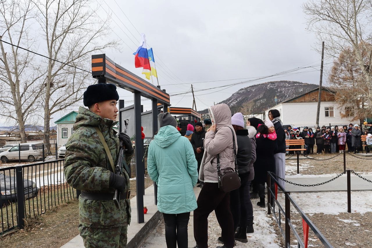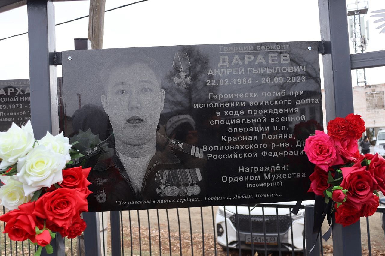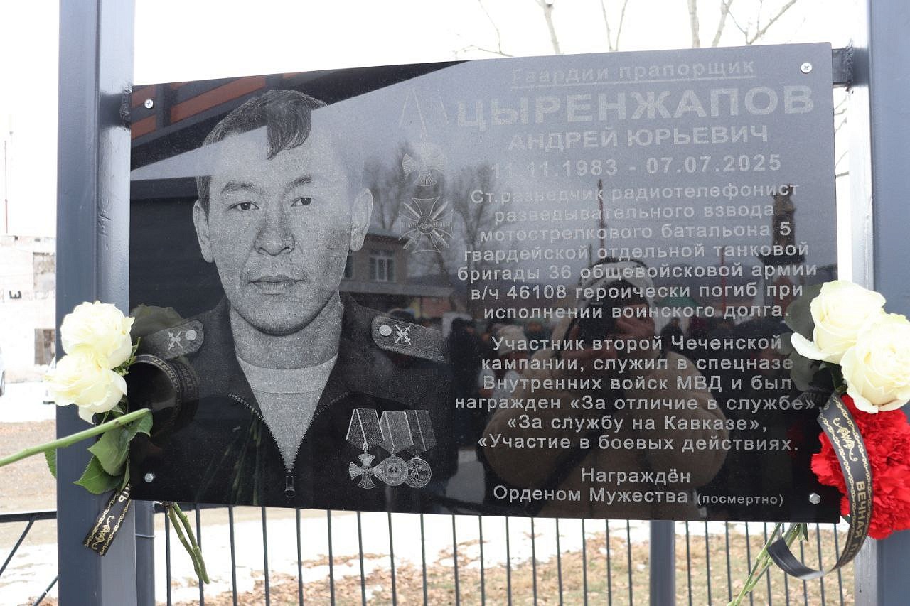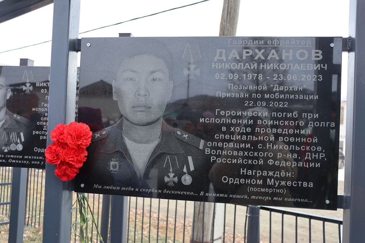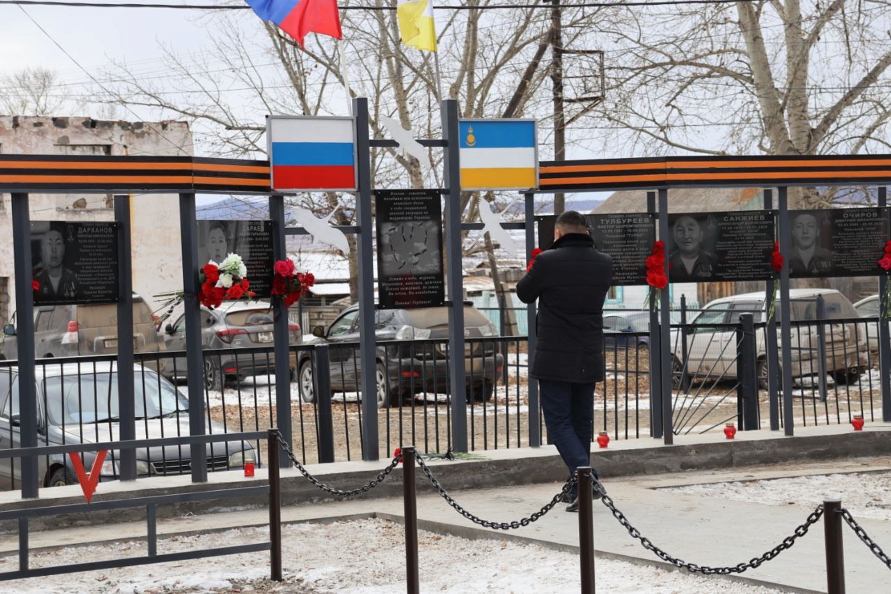 На мемориальных досках запечатлены воины с наградами, все они награждены посмертно орденом Мужества. Слава героям Отечества: военнослужащим: Виктору Цыремпиловичу Тулбурееву, Андрею Гырыловичу Дараеву, Дмитрию Михайловичу Очирову, мобилизованным: Александру Борисовичу Санжиеву, Николаю Николаевичу Дарханову, Денису Михайловичу Рычкову, добровольцам: Виктору Александровичу Рычкову, Андрею Юрьевичу Цыренжапову. Виктор Рычков с позывным «Витязь» пошёл добровольцем, чтобы найти брата, мобилизованного Москвитина Павла Анатольевича, пропавшего без вести в горниле войны, но сам погиб через 3 месяца смертью храбрых в посёлке Урожайном. На его памятной доске надпись: «Мы жертвовать готовы жизнью, хотя она нам раз дана, храните, юноши, Отчизну, она у нас, как мать, одна!». У Виктора Рычкова остались 3 детей.