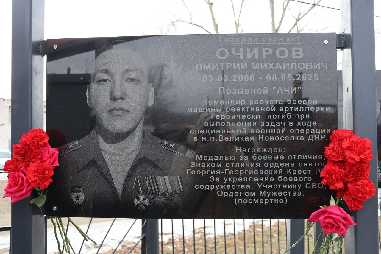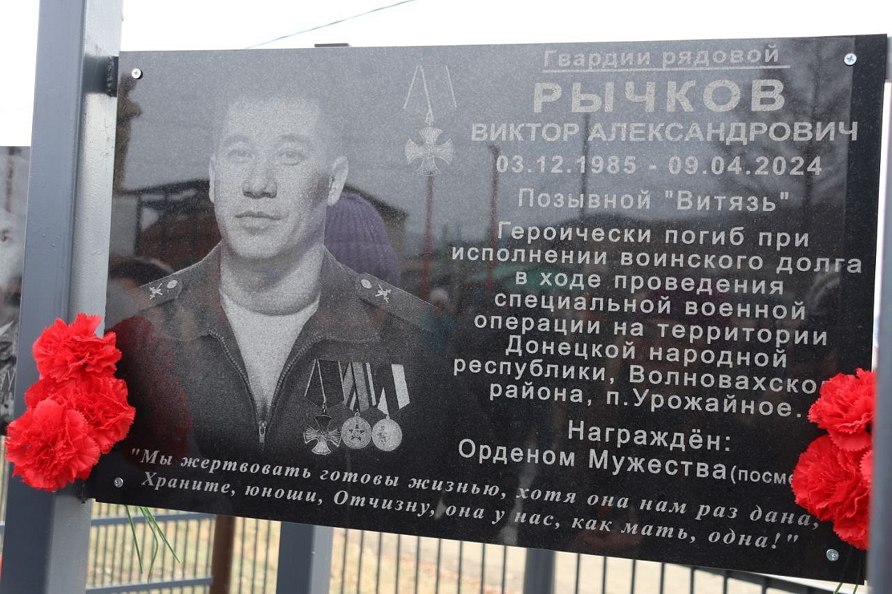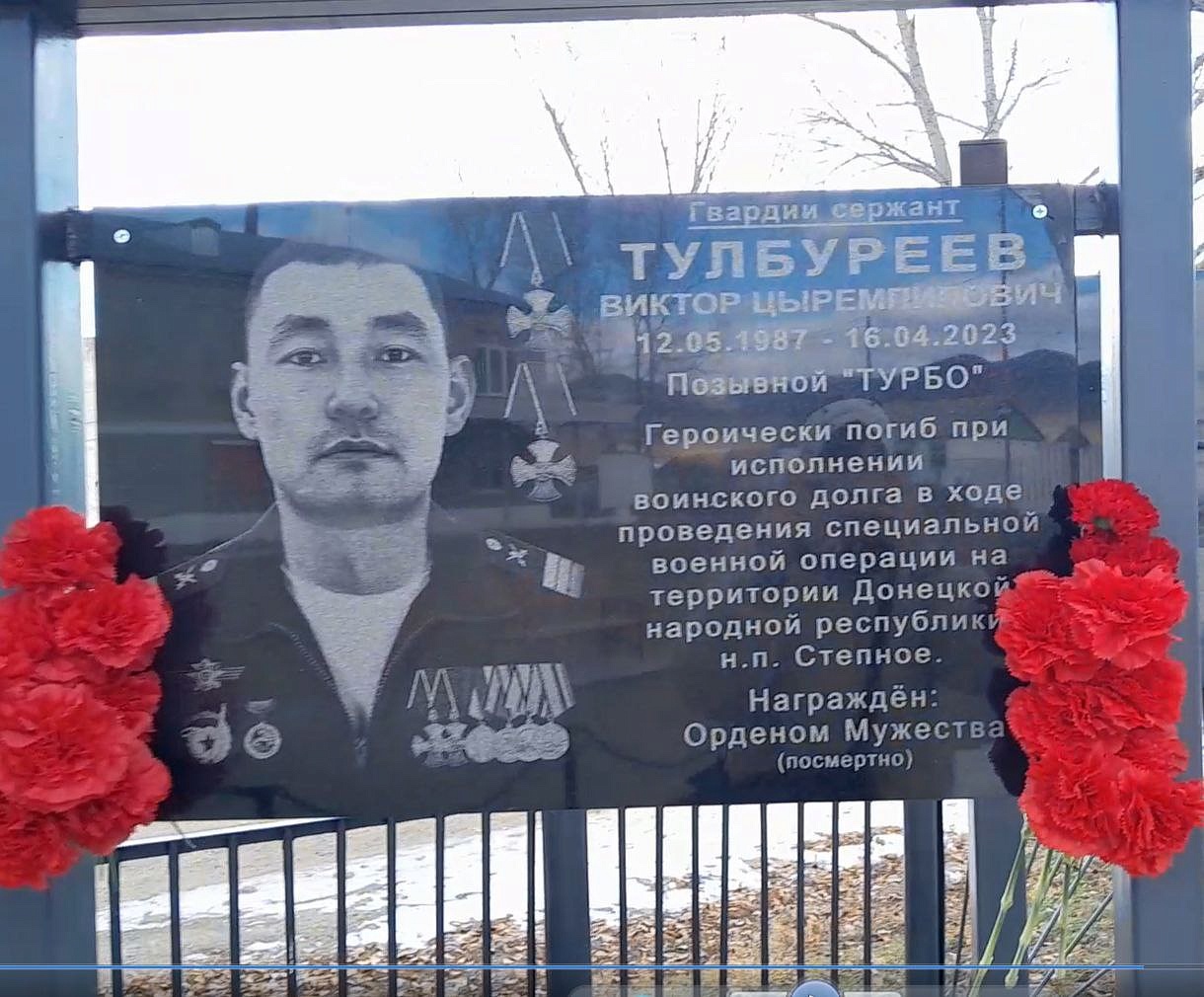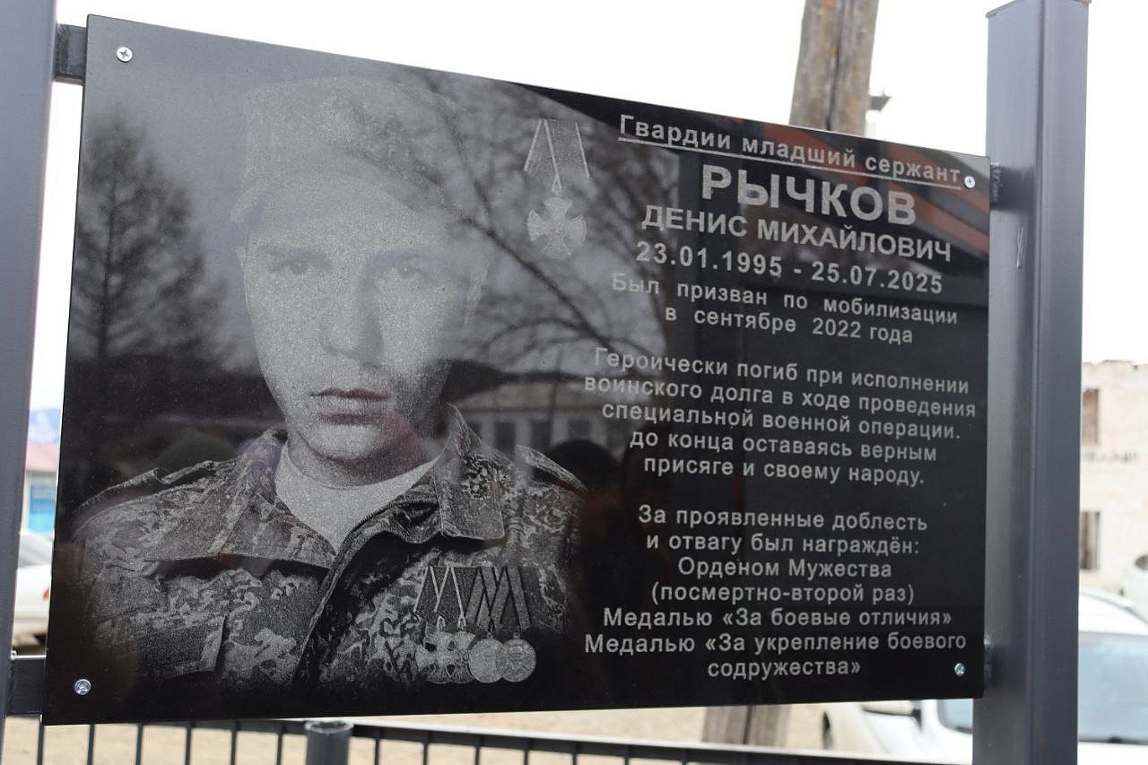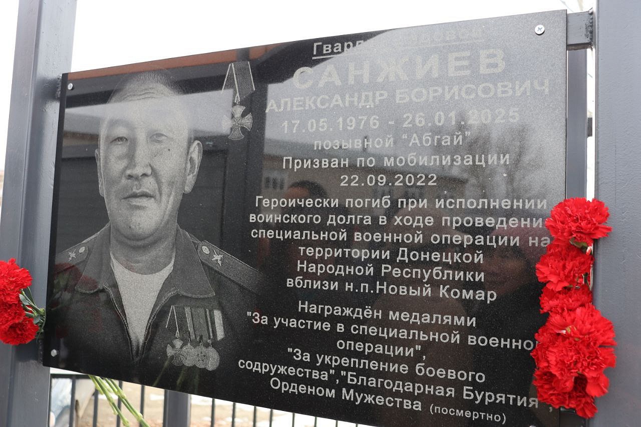 На мемориальных досках запечатлены воины с наградами, все они награждены посмертно орденом Мужества. Слава героям Отечества: военнослужащим: Виктору Цыремпиловичу Тулбурееву, Андрею Гырыловичу Дараеву, Дмитрию Михайловичу Очирову, мобилизованным: Александру Борисовичу Санжиеву, Николаю Николаевичу Дарханову, Денису Михайловичу Рычкову, добровольцам: Виктору Александровичу Рычкову, Андрею Юрьевичу Цыренжапову. Виктор Рычков с позывным «Витязь» пошёл добровольцем, чтобы найти брата, мобилизованного Москвитина Павла Анатольевича, пропавшего без вести в горниле войны, но сам погиб через 3 месяца смертью храбрых в посёлке Урожайном. На его памятной доске надпись: «Мы жертвовать готовы жизнью, хотя она нам раз дана, храните, юноши, Отчизну, она у нас, как мать, одна!». У Виктора Рычкова остались 3 детей.