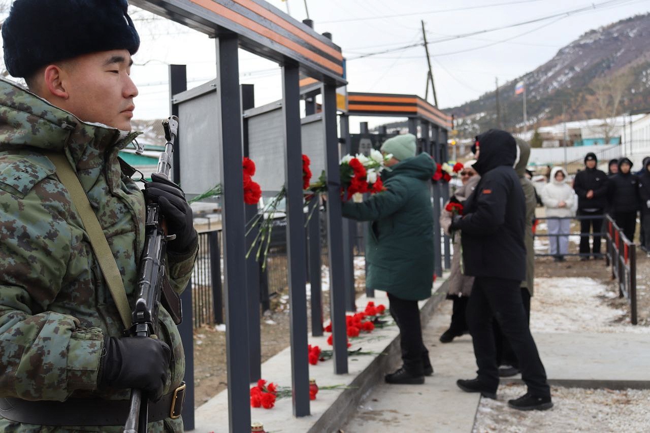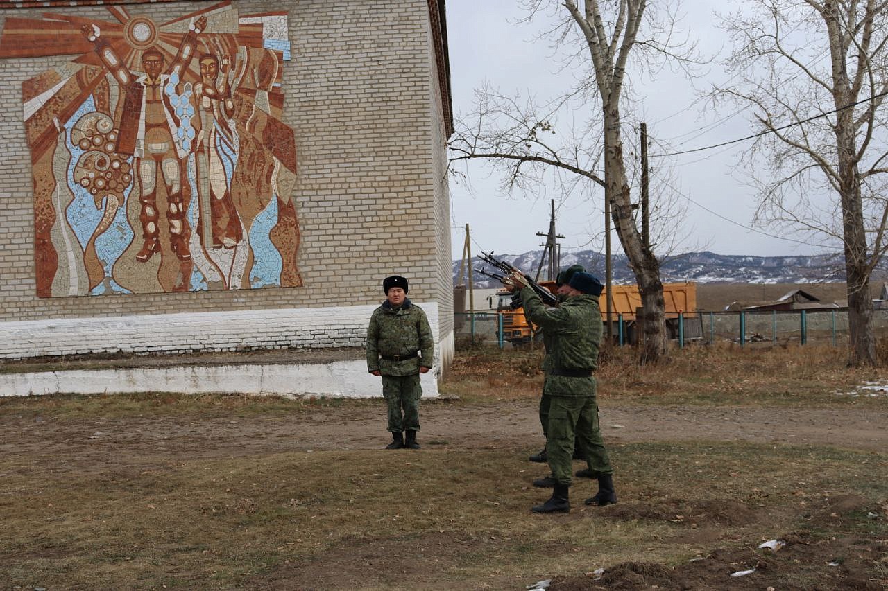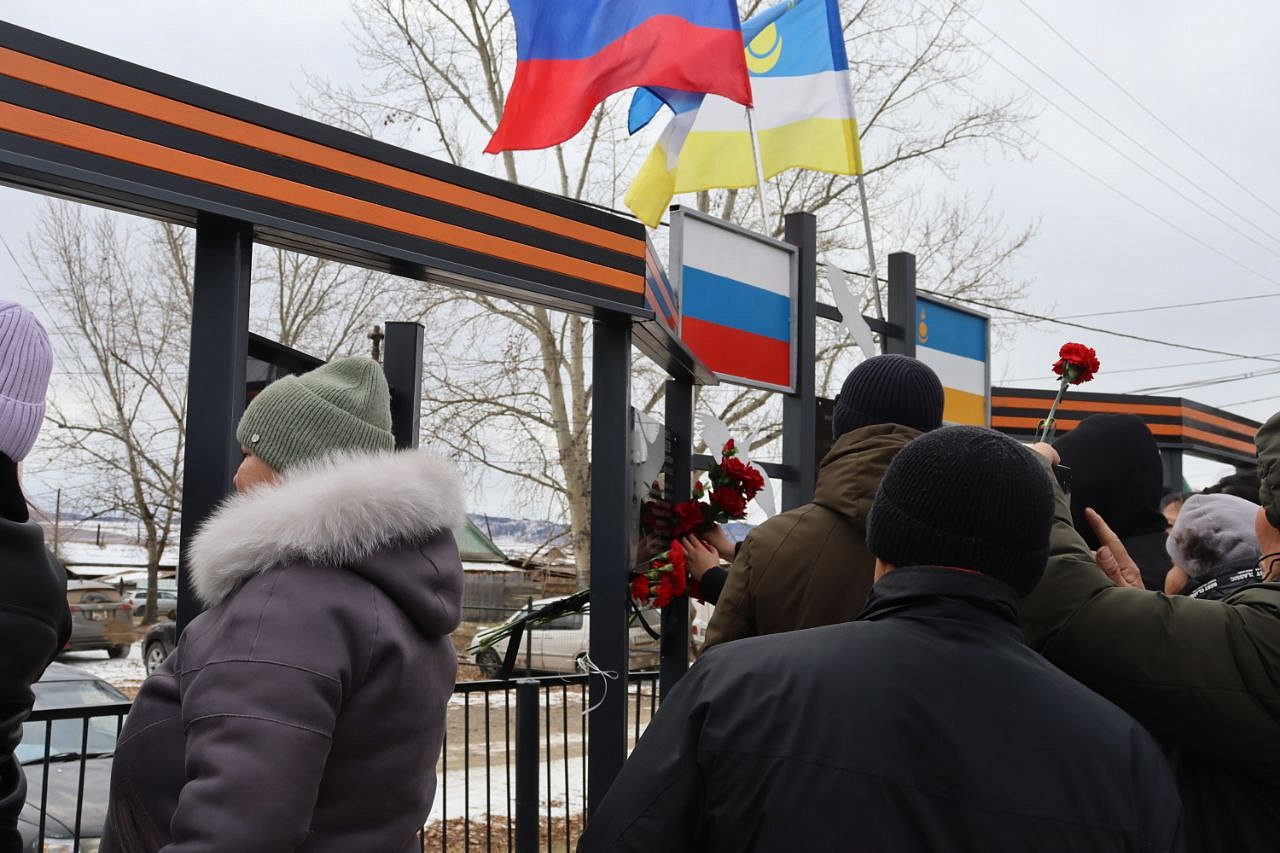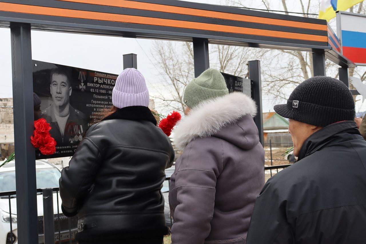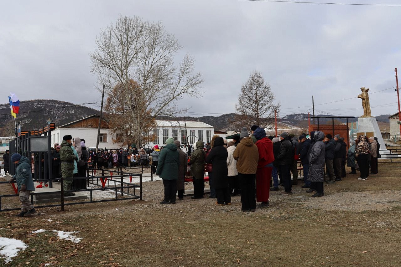 На мемориальных досках запечатлены воины с наградами, все они награждены посмертно орденом Мужества. Слава героям Отечества: военнослужащим: Виктору Цыремпиловичу Тулбурееву, Андрею Гырыловичу Дараеву, Дмитрию Михайловичу Очирову, мобилизованным: Александру Борисовичу Санжиеву, Николаю Николаевичу Дарханову, Денису Михайловичу Рычкову, добровольцам: Виктору Александровичу Рычкову, Андрею Юрьевичу Цыренжапову. Виктор Рычков с позывным «Витязь» пошёл добровольцем, чтобы найти брата, мобилизованного Москвитина Павла Анатольевича, пропавшего без вести в горниле войны, но сам погиб через 3 месяца смертью храбрых в посёлке Урожайном. На его памятной доске надпись: «Мы жертвовать готовы жизнью, хотя она нам раз дана, храните, юноши, Отчизну, она у нас, как мать, одна!». У Виктора Рычкова остались 3 детей.