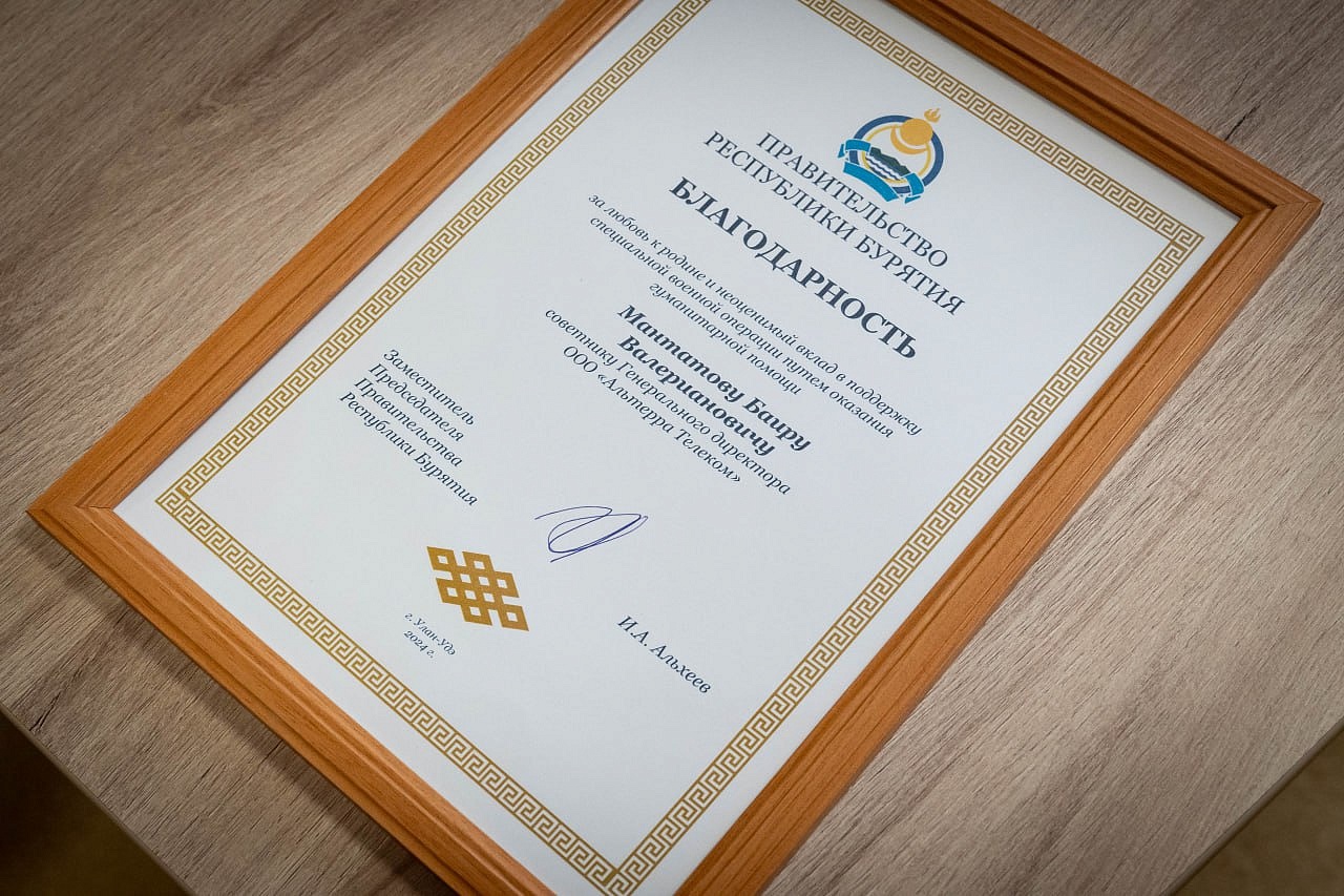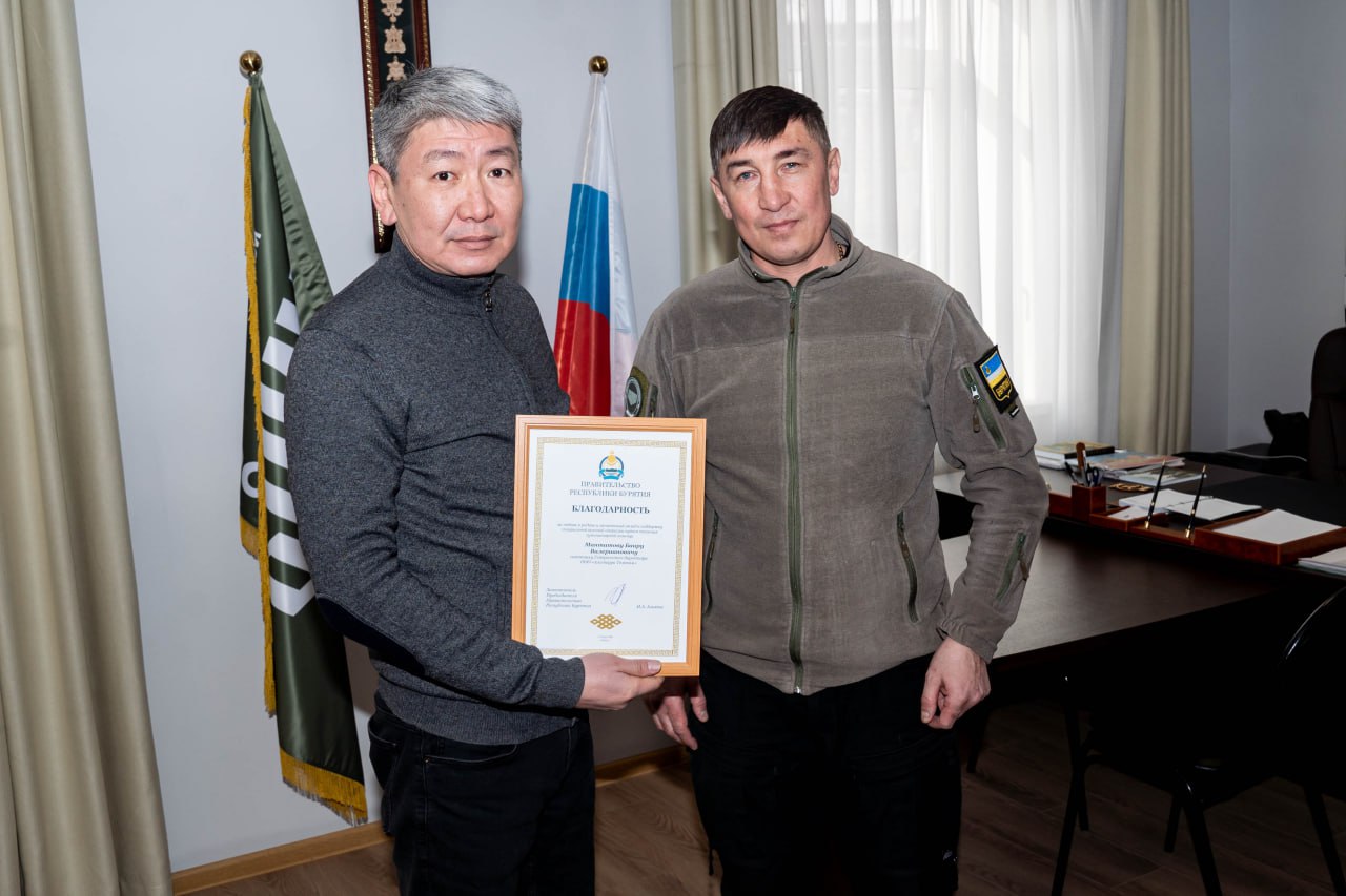 «Вручили благодарность от Правительства Бурятии за подписью зампреда правительства РБ Ивана Альхеева – за любовь к родине и неоценимый вклад в поддержку специальной военной операции путем оказания гуманитарной помощи военнослужащим», - сообщили в Центре «Воин».