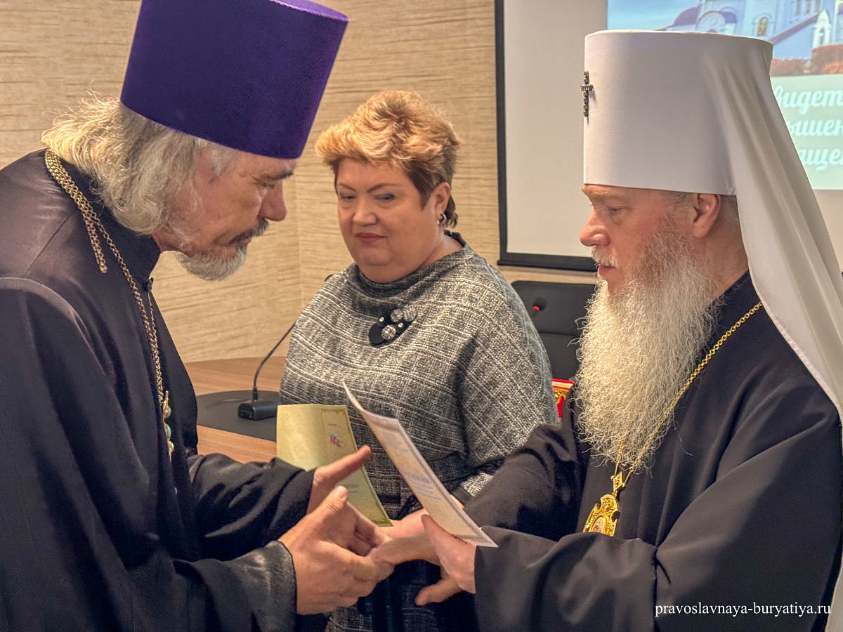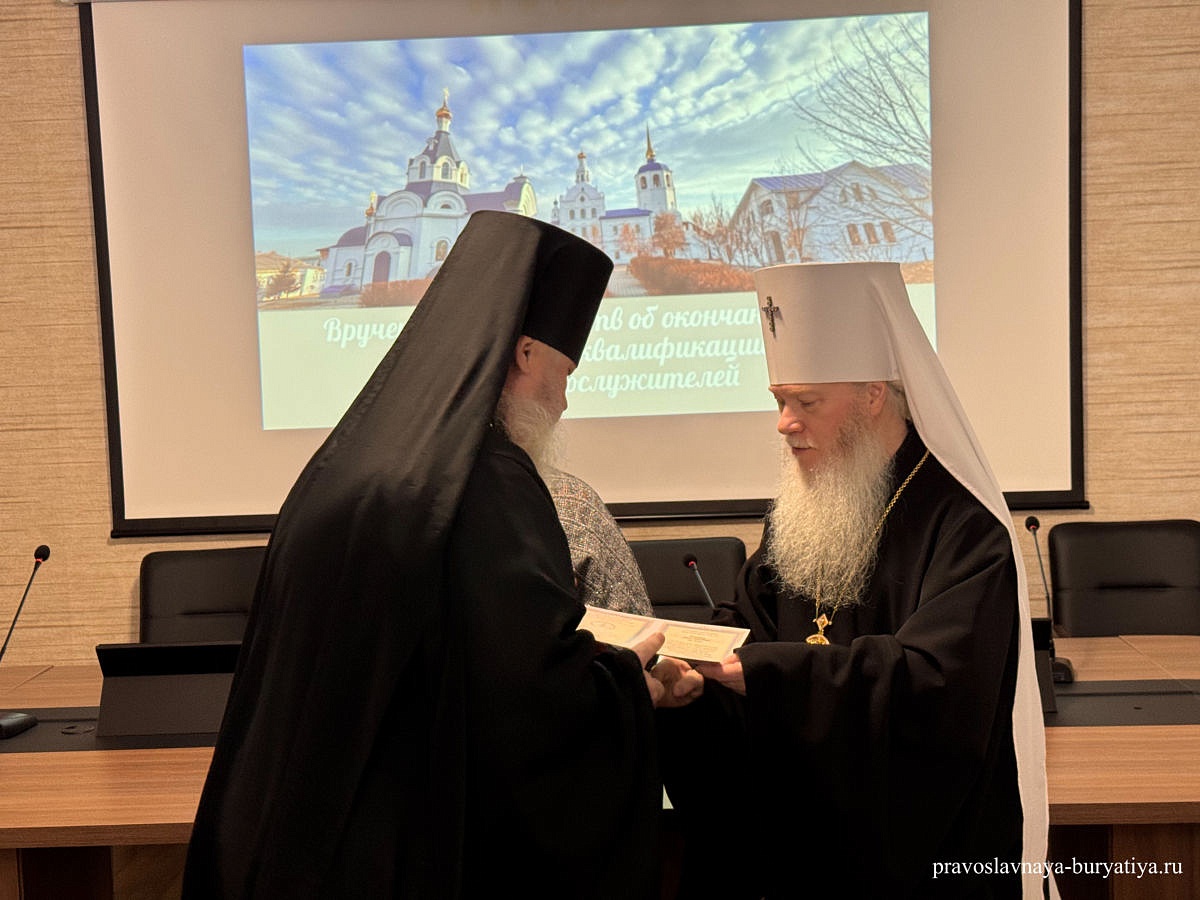 «24 декабря в здании культурно-просветительского центра Улан-Удэнской и Бурятской епархии состоялось вручение свидетельств о прохождении курсов повышения квалификации священнослужителей. Вручил свидетельства митрополит Улан-Удэнский и Бурятский Иосиф. Свидетельства от Бурятского Государственного университета вручила заведующая кафедрой теологии БГУ Светлана Владимировна Васильева», - сообщили в епархиальной пресс-службе.