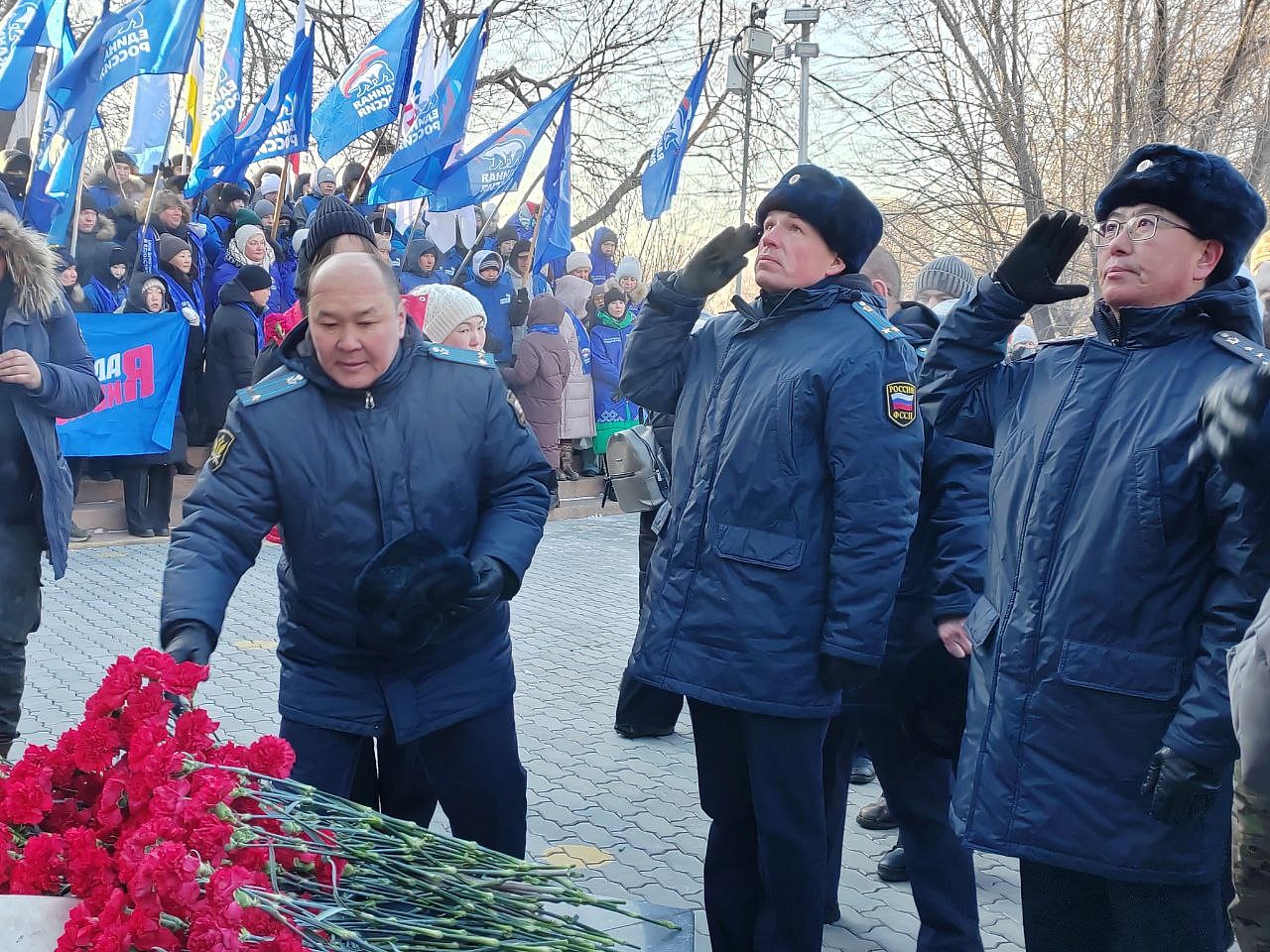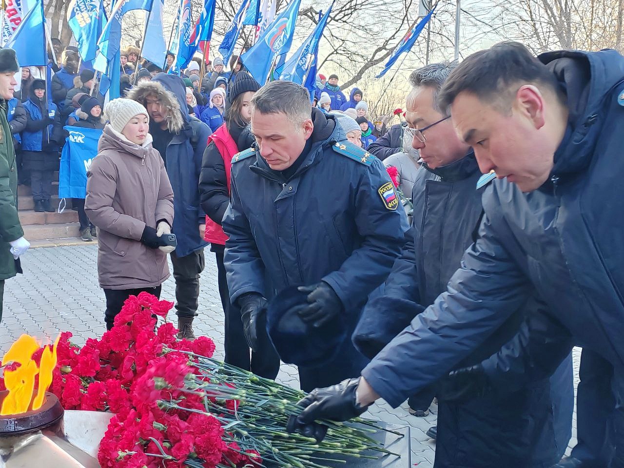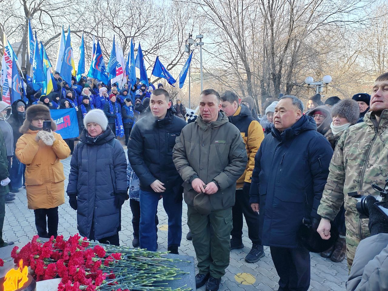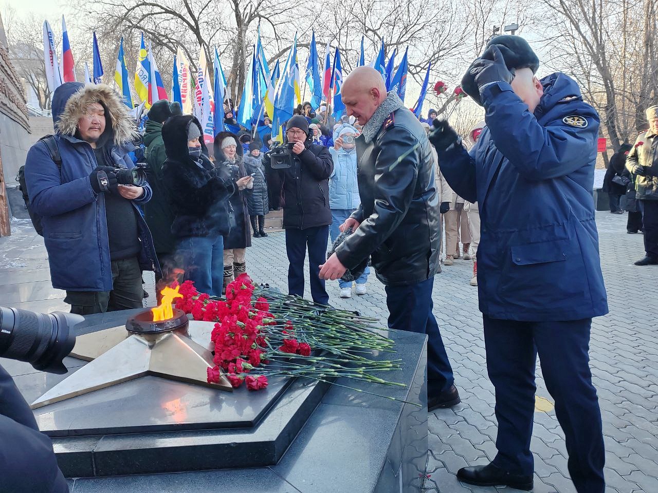 Несмотря на сильный мороз на мемориале Победы собралось сегодня множество организаций и обычных горожан, представители всех ветвей власти, общественных организаций и учреждений образования. Торжественный митинг в честь Дня защитника Отечества открыл врио командующий 36 армии ВВО, генерал-майор, Герой России Владимир Анатольевич Белявский, Глава Бурятии Алексей Цыденов и другие руководители республики.