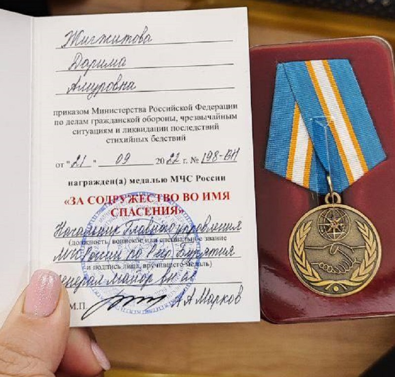 «Государственная награда министерства Российской Федерации по делам гражданской обороны, чрезвычайным ситуациям и ликвидации стихийных бедствий - вручена человеку, который на своих хрупких плечах организовывал весь процесс от сбора до погрузки всех 170 тонн помощи. Медалью «За содружество во имя спасения» удостоена руководитель ресурсного центра добровольчества «ДоброДом» Дарима Жигжитова», - сообщили в Минспорта Бурятии.