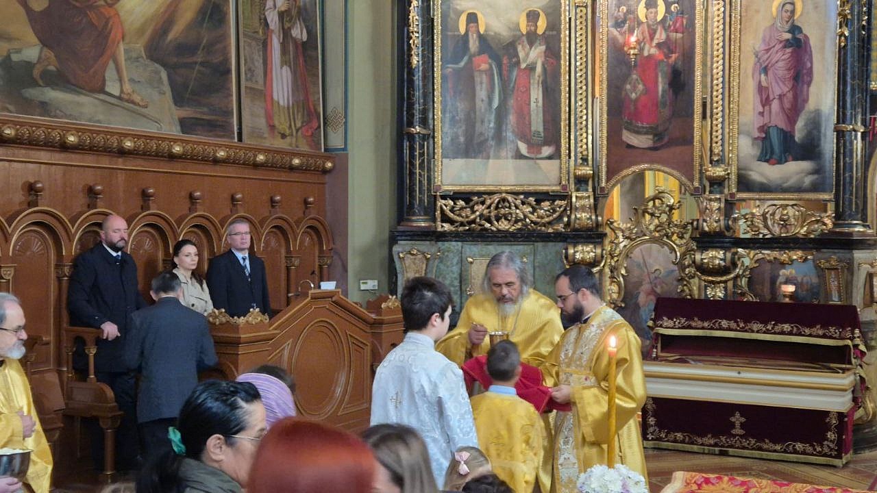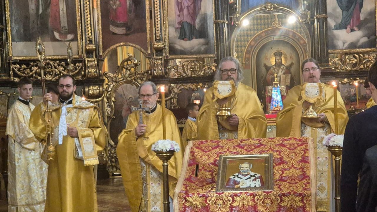 - Сербские праздничные мероприятия начались в воскресенье 19 октября совершением литургии в соборном храме в честь святителя Николая. Я сослужил ректору знаменитой Карловацкой семинарии протоиерею Иоанну Милановичу. В алтаре молился митрополит Сремский Василий (Вадич). Богослужения в этом храме совершаются рядом с мощами святителя Арсения, архиепископа Сербского, ученика Саввы Сербского. В 1920-30-е годы Никольский храм был кафедральным храмом Русской Православной Церкви Зарубежом.