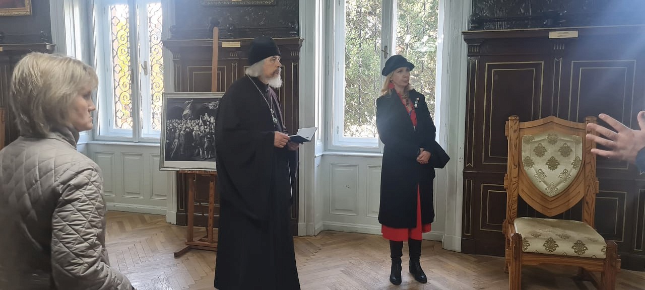 Для гостей из Бурятии была проведена экскурсия по историческим местам центральной части города Сремски-Карловци. Много было уделено внимания Патриаршему Дому, ныне летней резиденции патриарха Сербского и резиденции митрополита Сремского. Этот Дом - очень памятное место для Русской Церкви. Именно в нем было принято решение о создании Русской Православной Церкви Заграницей. В этом доме располагался Синод РПЦЗ в 1920-30-е годы. При входе в здание на столбе у ворот находится барельеф митрополита Антония Храповицкого, главы РПЦЗ. В заднем здании двора резиденции было показано место бывшей часовни, где совершались службы Русской Церкви. Сегодня здесь находится производство вина для литургии.