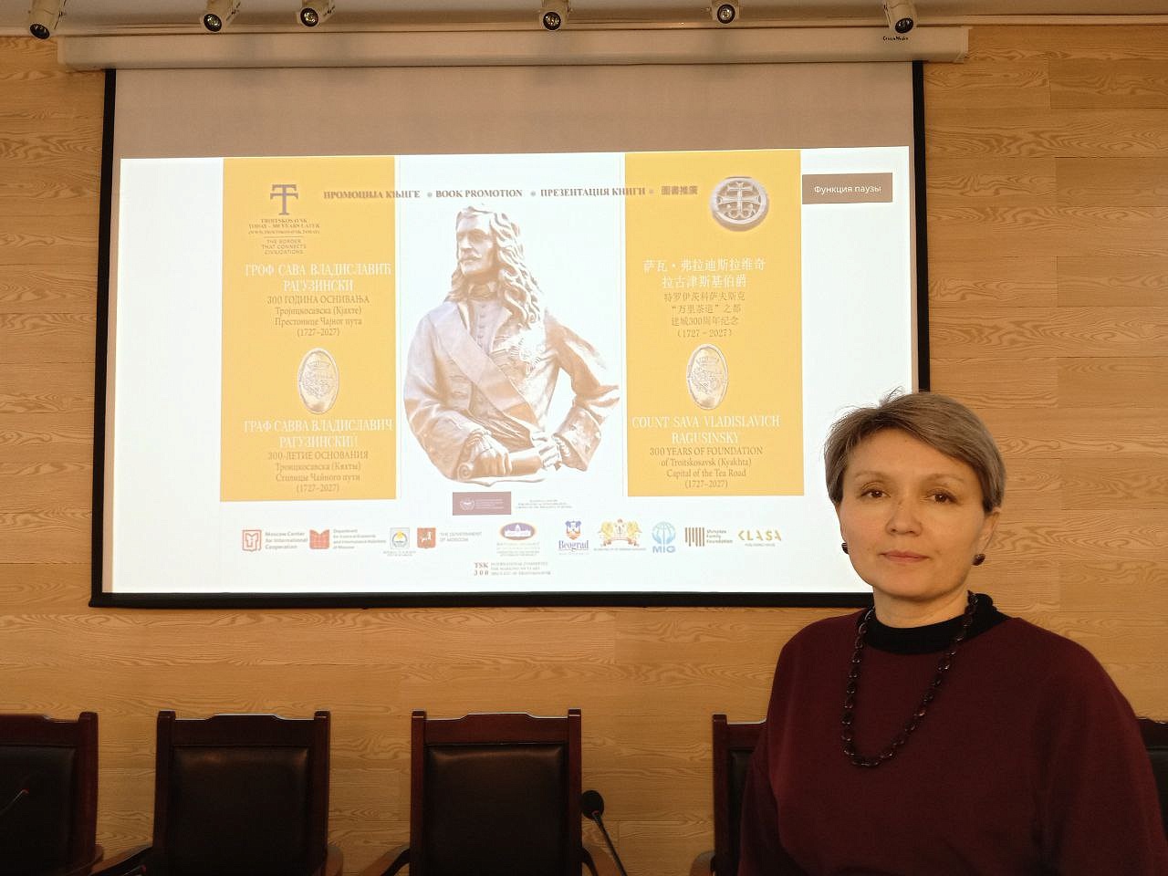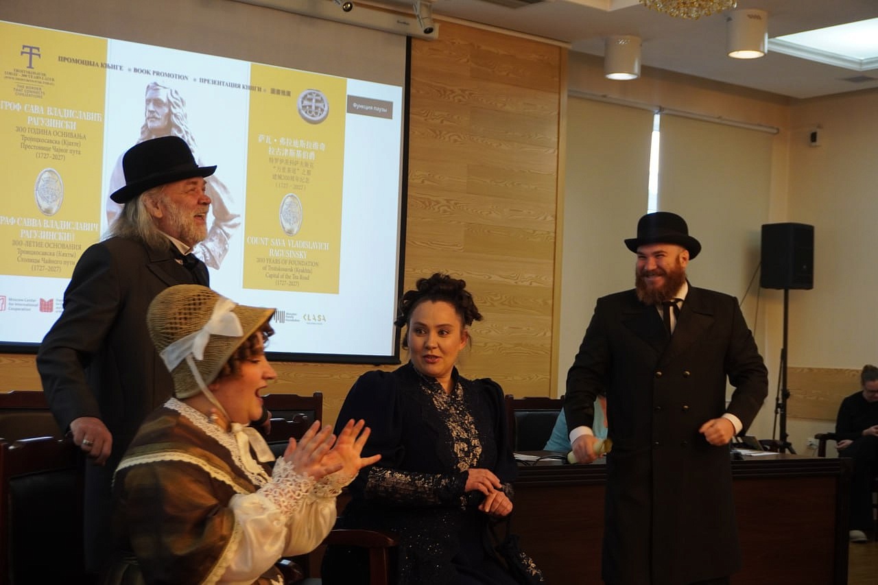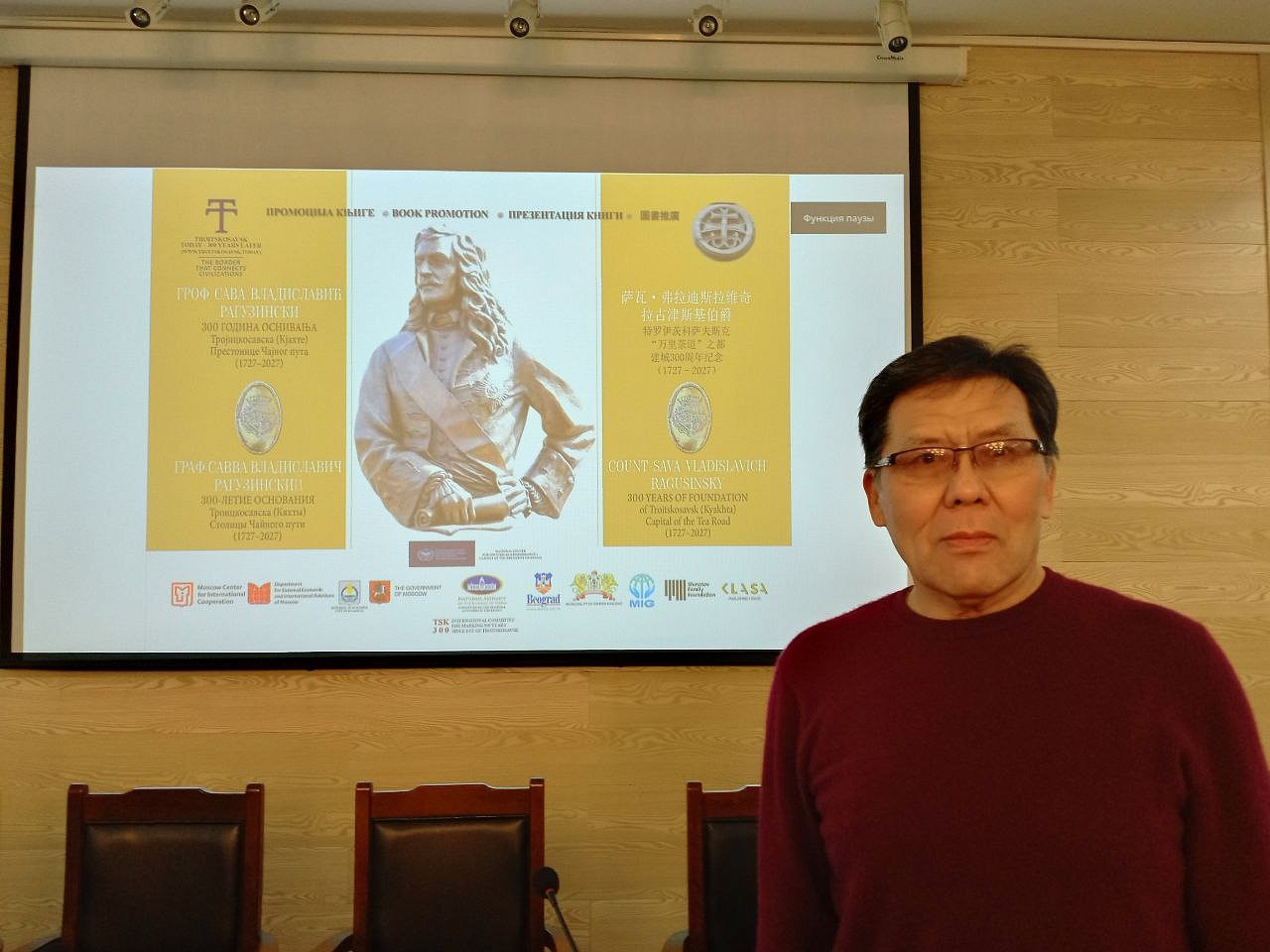 - Уважаемые друзья, для меня большая честь сегодня участвовать в презентации монографии «Граф Сава Владиславич, 300 лет Троицкосавска - столицы Великой Чайного пути». 1727 год - это год, который мы вспоминаем сегодня, и мне очень приятно пить чай вместе с вами накануне этой великой годовщины и говорить об этой монументальной книге, которая содержит 752 страницы и стала огромным трудом людей из разных стран, Это ученые и исследователи из Китая, Италии, Испании, Университета Гента в Бельгии, а также из России, Национального центра исторической памяти, который находится в аппарате президента, академики Сербской академии наук и искусств, такие как академики Славенко Терзич, Крестич, Любомир Максимович, а также Сяо Лэй Джин, профессор Ли Хайбао, Елена Петровна Малышева, - надеюсь, я никого не пропущу, особенно молодого, возможно, самого молодого соавтора этой монографии, исследователя Мирко Галаcсо, докторанта Университета Удине из Италии.