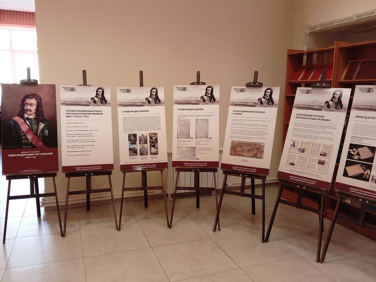 Перед входом в зал была развёрнута большая выставка на планшетах, посвящённая выдающемуся дипломату, основателю российской разведки и Троицкосавска графу Савве Владиславичу - Рагузинскому. Здесь же была размещена выставка-продажа книг о Савве Рагузинском, о Великом чайном пути, в том числе двухтомника Игоря Захаренко, организованная большим знатоком истории жизненного пути Саввы Рагузинского Татьяной Александровной Бояркиной. Она давала зрителям подержать первый сигнальный экземпляр новой книги по кяхтинским купцам, координатором проекта которого она была.