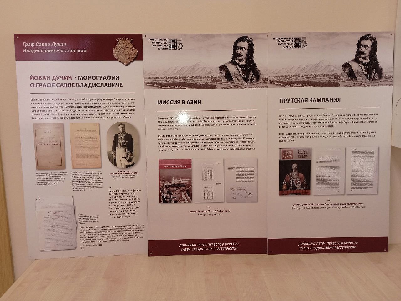 - Наше детальное знакомство с личностью Саввы Рагузинского произошло в 2019 году, когда по случаю 350-летия дипломата мы запросили материалы в Историко-документальном департаменте МИД России. Полученные уникальные архивные документы о дипломатической миссии Саввы Рагузинского, в том числе датируемые 1725 годом, были продемонстрированы в мультимедийной выставке «Дипломат Петра Первого в Бурятии: Савва Владиславич -Рагузинский», подготовленной Национальной библиотекой Бурятии в партнерстве с Представительством МИД России в г. Улан-Удэ (выставка демонстрировалась в Президентской библиотеке имени Б. Н. Ельцина, г. Санкт-Петербург). Также эти материалы были представлены нами вместе с докладом об исторической роли Саввы Рагузинского в ходе Круглого стола в Кяхте, посвященного 125-летию со дня основания Троицкосавско - Кяхтинского отделения Приамурского отдела Императорского Русского географического общества.