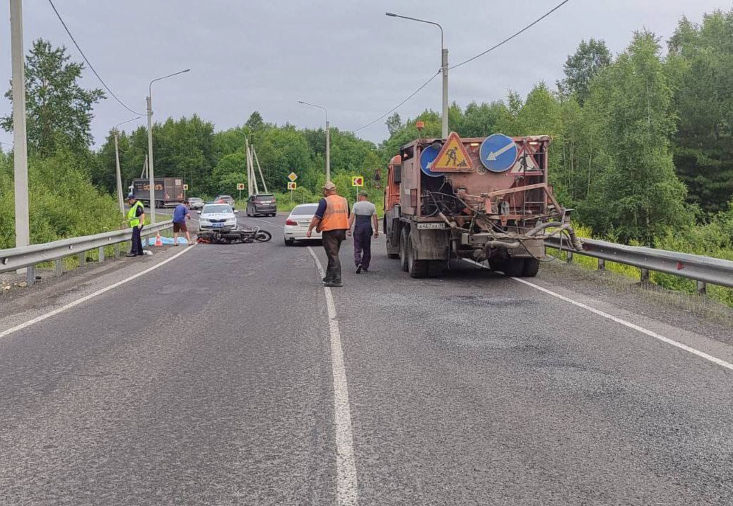 Мотоциклист от полученных травм скончался на месте происшествия. На участке дороги затруднено движение транспорта.