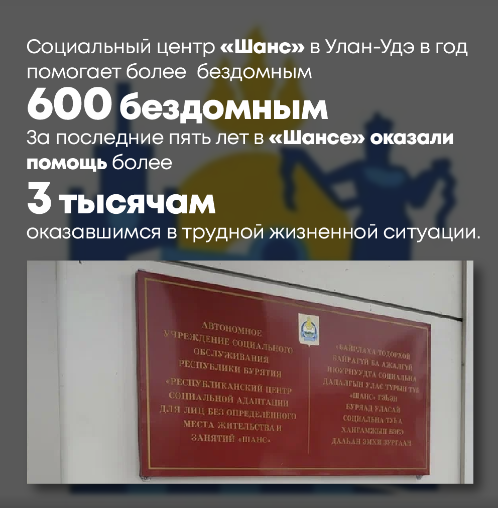 В Минсоцзащиты Бурятии отметили, что в центре «Шанс» гражданам оказывается юридическая и другая консультативная помощь, содействие в восстановлении социально-полезных и родственных связей, в прохождении медико-социальной экспертизы для определения инвалидности, помощь в оформлении социальных выплат.