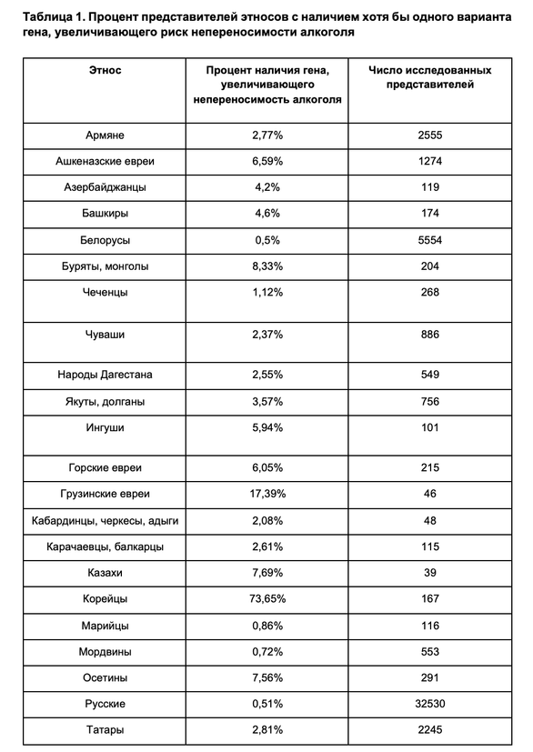 Самый низкий процент непереносимости алкоголя среди исследуемых этнических групп был выявлен у русских и белорусов — 0,51% и 0,50% соответственно.