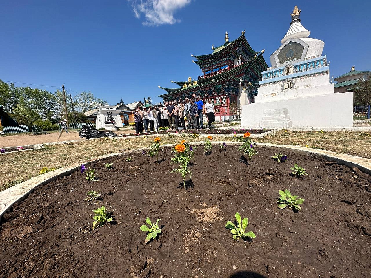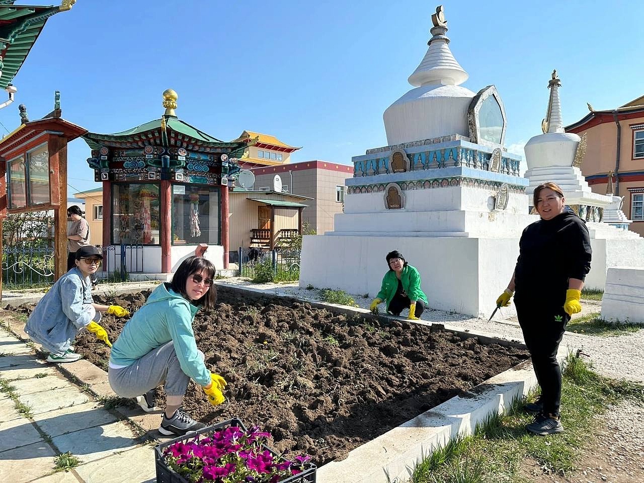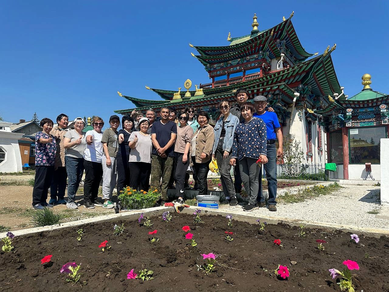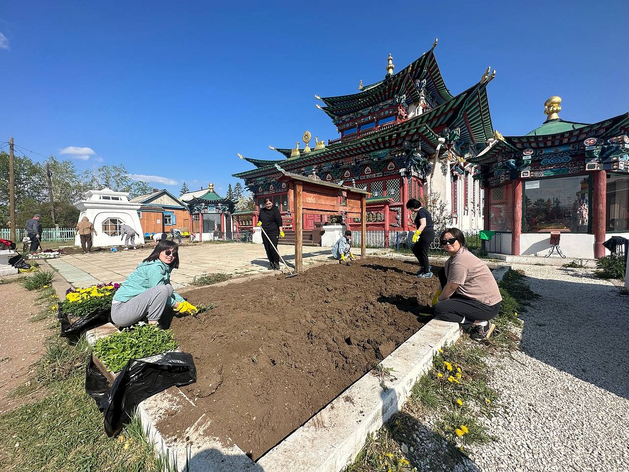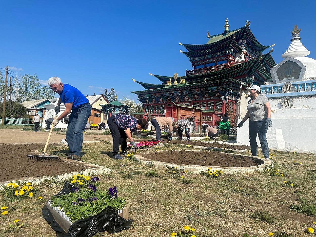Продолжается священный месяц Сака Дава, когда все благие деяния увеличиваются во много тысяч раз. Уже третий год подряд в этот месяц сотрудники «Буркоопсоюза» приезжают в Иволгинский дацан, чтобы украсить территорию перед Дворцом Пандито Хамбо Ламы Этигэлова и высаживают цветы.