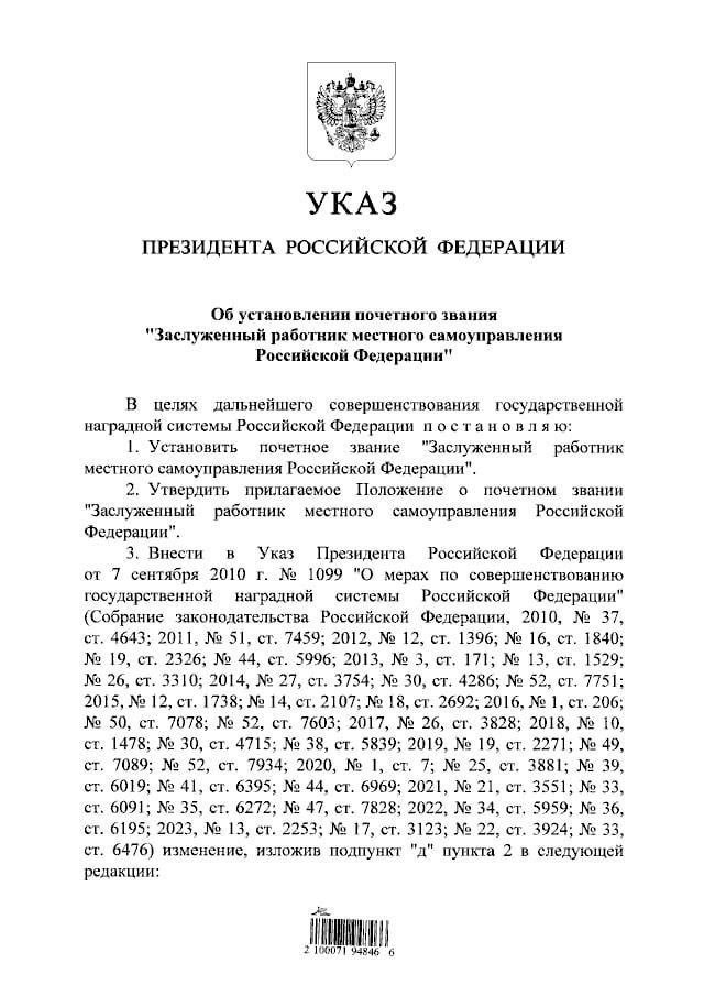 Сегодня президент России установил в стране почетное звание «Заслуженный работник местного самоуправления». Соответствующий указ опубликован на сайте правовых актов. Отмечается, что цель нового звания — дальнейшее совершенствование государственной наградной системы.