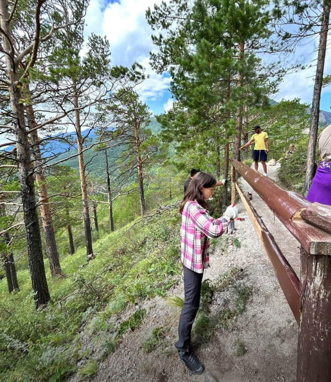 Так, вчера сотрудники нацпарка совместно с Дианой Скворцовой - волонтером из Москвы покрасили новые ограждения, установленные на опасных участках экологической тропы «Пик Любви».