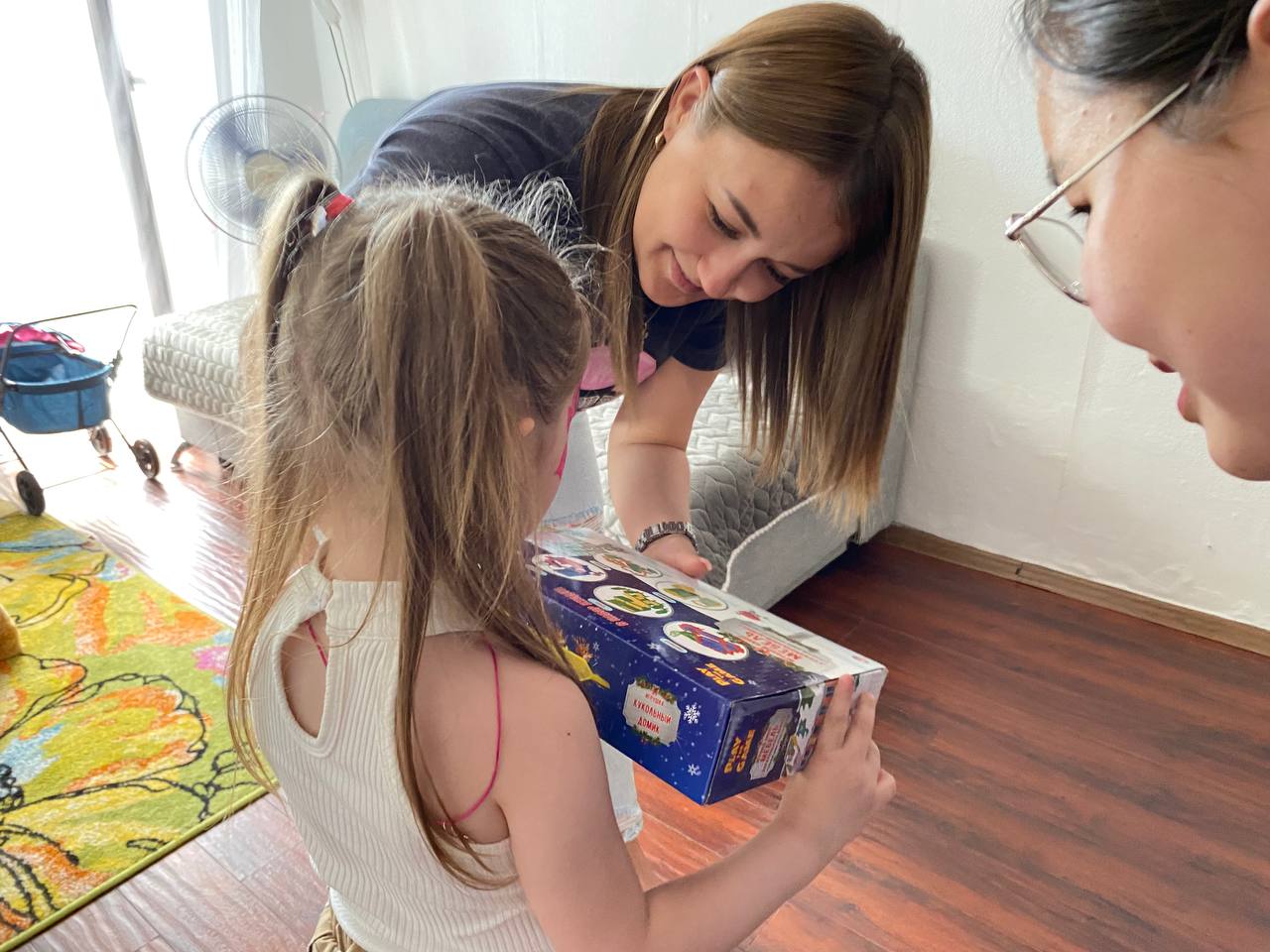 В первый день лета активисты поздравили Ксюшу, дочь, военнослужащего, с праздником и подарили малышке набор развивающих игрушек.