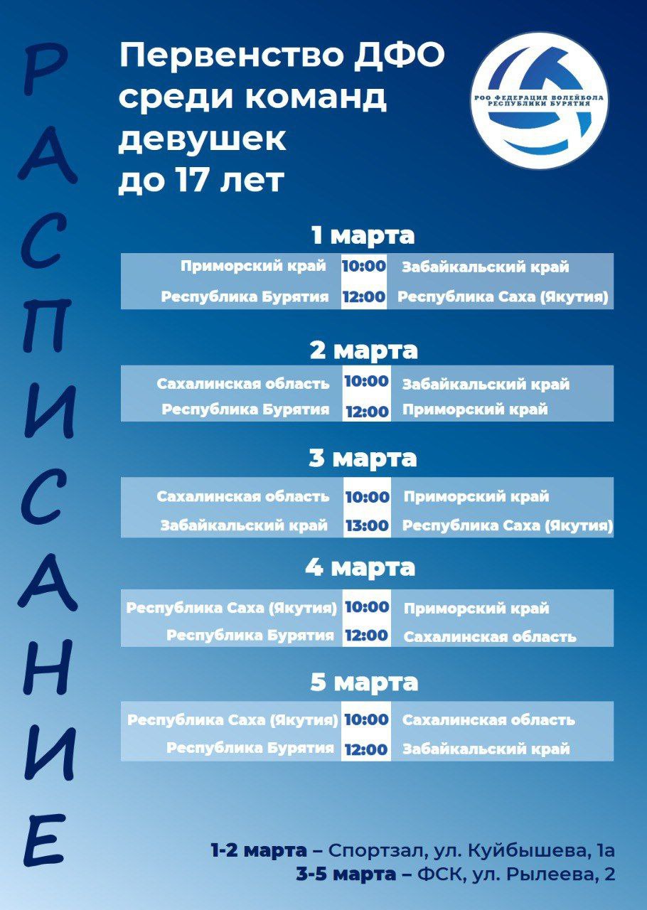 С 28 февраля по 5 марта Улан-Удэ станет центром волейбольной жизни Дальнего Востока. Впервые в республике состоится Первенство ДФО по волейболу среди команд девушек до 17 лет (2009-2010 г.р.).
