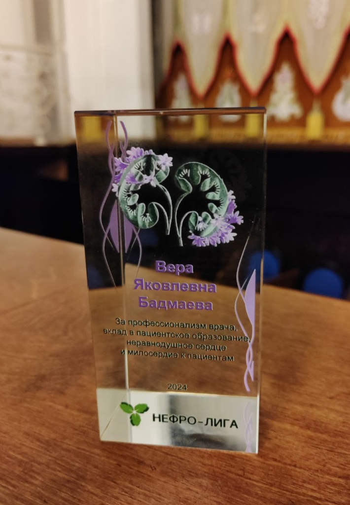 Небесной красоты памятный знак, он же премия Всероссийской пациентской организации "Нефро-Лига", вручена сегодня главному нефрологу Минздрава Бурятии, руководителю нефрологического центра Республиканской больницы имени Семашко Вере Яковлевне Бадмаевой.