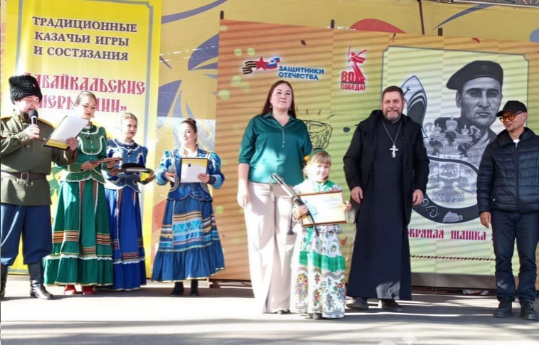 Анна отметила, что Денис Леонов не только сам помогал во всём, но и его маленький сын Иван участвовал в конкурсе. Он награждён памятной статуэткой «Самому юному казаку» и часами «Потомственный казак». Специальный приз ему вручила мама погибшего участника СВО из Кяхтинского района Степана Осеева Лидия Ивановна.
