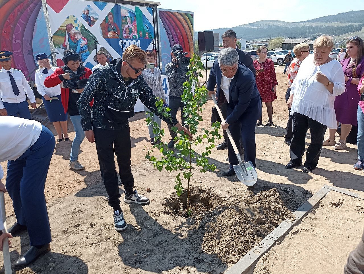 Глава Бурятии вместе с новоселами посадили деревья. Также предложил молодым жильцам создать ТОС, чтобы сподручнее было ухаживать за домом и развивать придомовой сад.