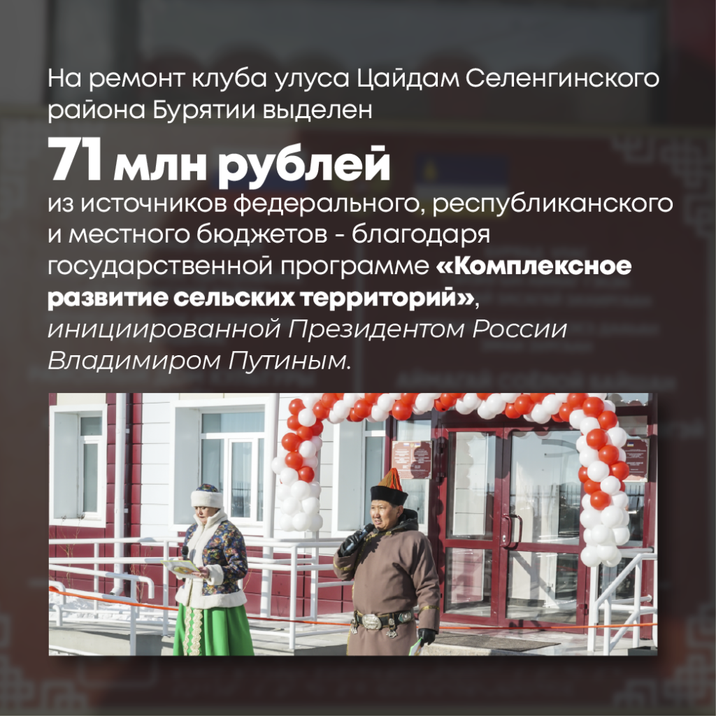 Это стало возможным благодаря государственной программе «Комплексное развитие сельских территорий», инициированной Президентом России Владимиром Путиным. На ремонт клуба улуса Цайдам Селенгинского района Бурятии выделен 71 млн рублей из источников федерального, республиканского и местного бюджетов.