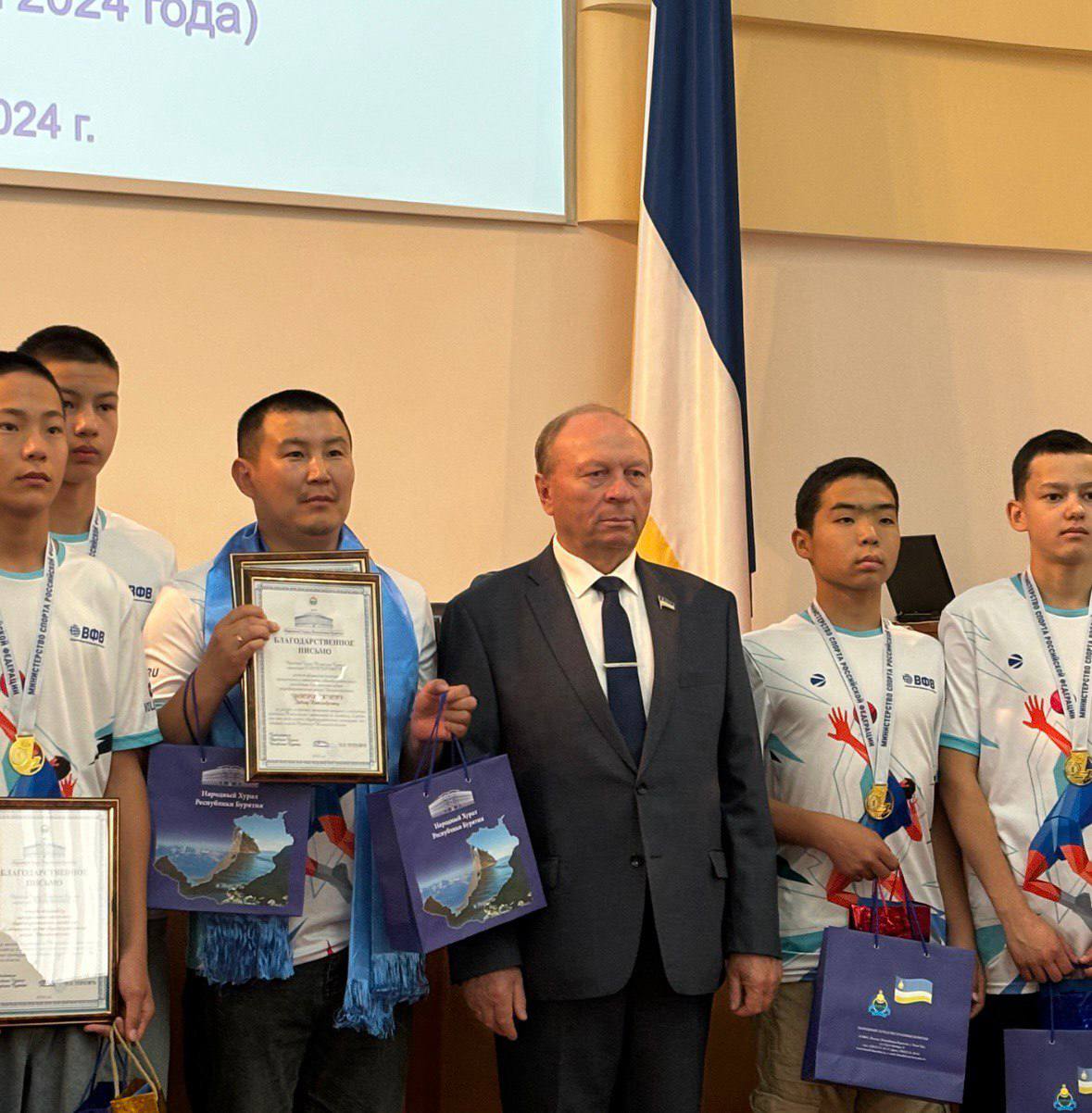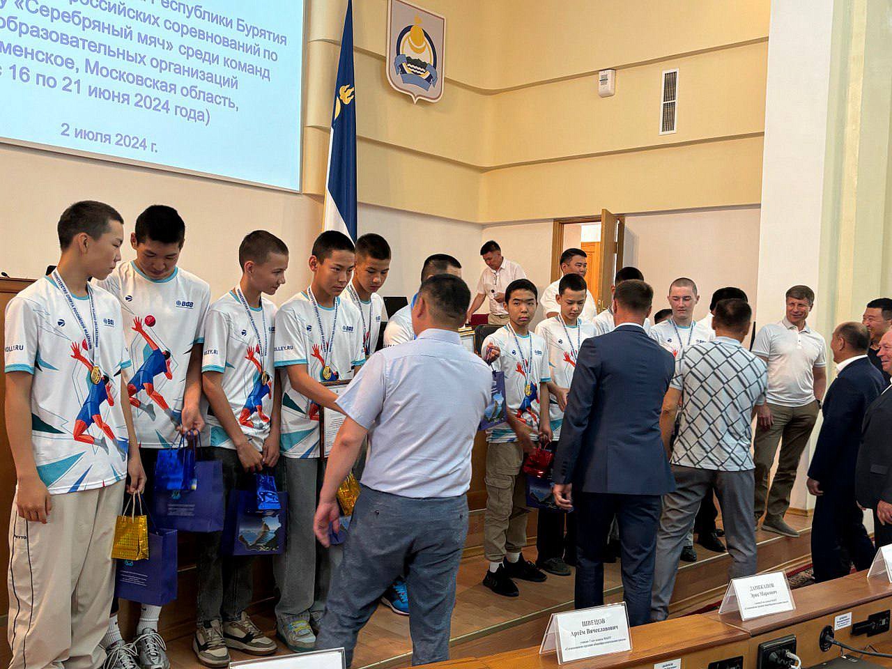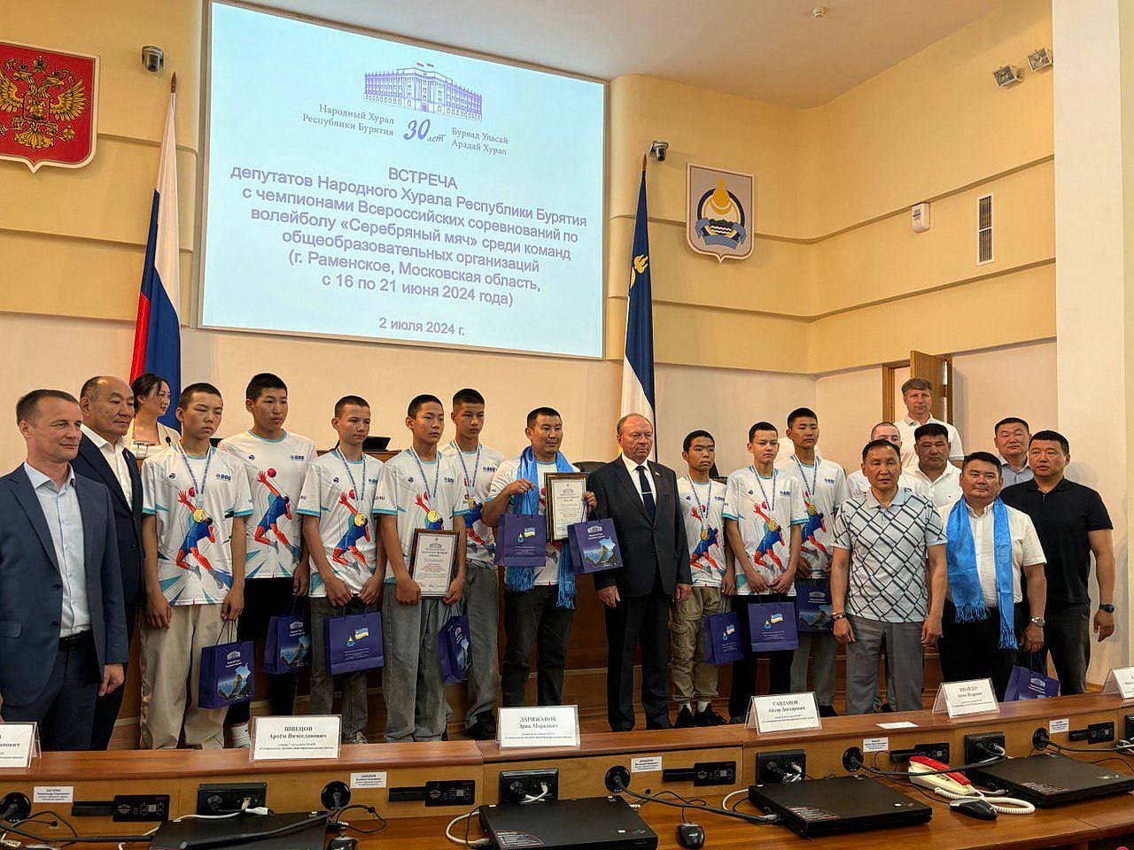 Депутаты Народного Хурала поздравили чемпионов Всероссийских соревнований по волейболу «Серебряный мяч» среди команд общеобразовательных организаций, прошедших с 16 по 21 июня в городе Раменское Московской области.