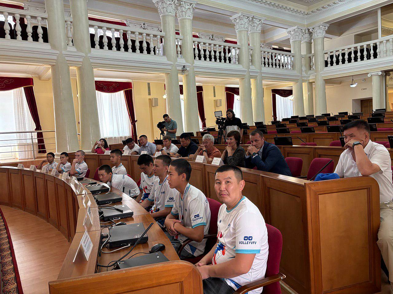 Сегодня, 2 июля, народные избранники собрались в «колонном» зале Народного Хурала, чтобы выразить благодарность юным волейболистам и тренерам Сотниковской СОШ. Спортсменов поприветствовали председатель Народного Хурала Владимир Павлов, его заместитель Баир Гармаев, депутаты Виталий Лыгденов, Михаил Степанов, Семен Матхеев, Вячеслав Дондоков, Бадмадоржо Жигжитов, а также начальник отдела дошкольного и общего образования профильного комитета Минобрнауки Бурятии Елена Тулаева и другие.