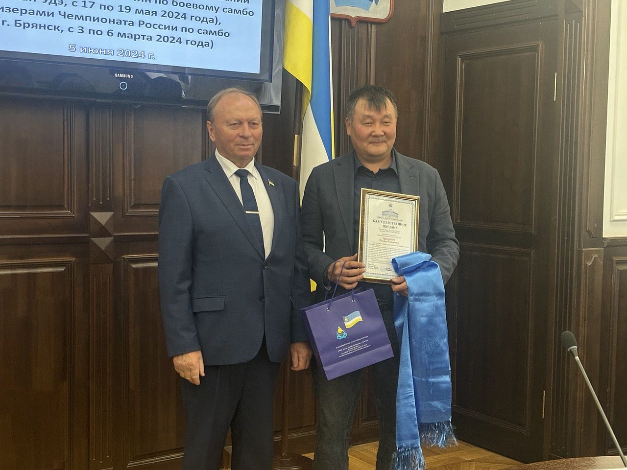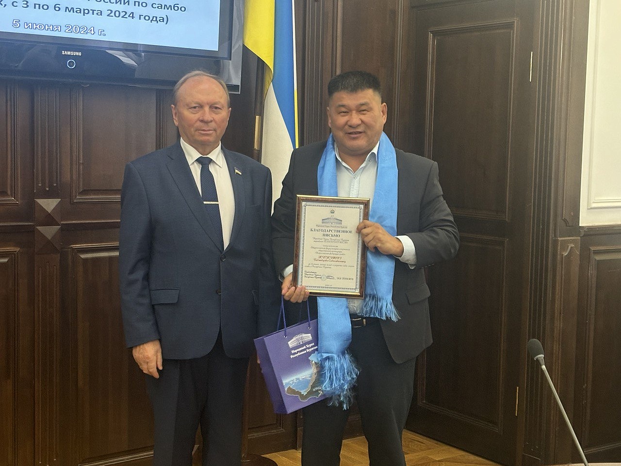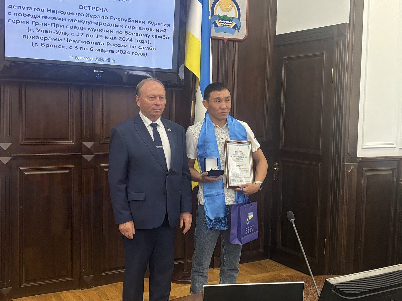 В завершении встречи председатель республиканского парламента Владимир Павлов вручил благодарственные письма Народного Хурала Республики Бурятия, памятные подарки, хадаки зампредседателя Комитета Народного Хурала по экономической политике, члену исполкома Общероссийской физкультурно-спортивной общественной организации «Всероссийская федерация самбо» Бадмадоржо Жигжитову, спортсменам Константину Подойницыну и Алдару Намсараеву, действующему тренеру по боевому самбо Жаргалу Жигжитову, старшему тренеру по боевому самбо Бальжиру Цыдыпову.