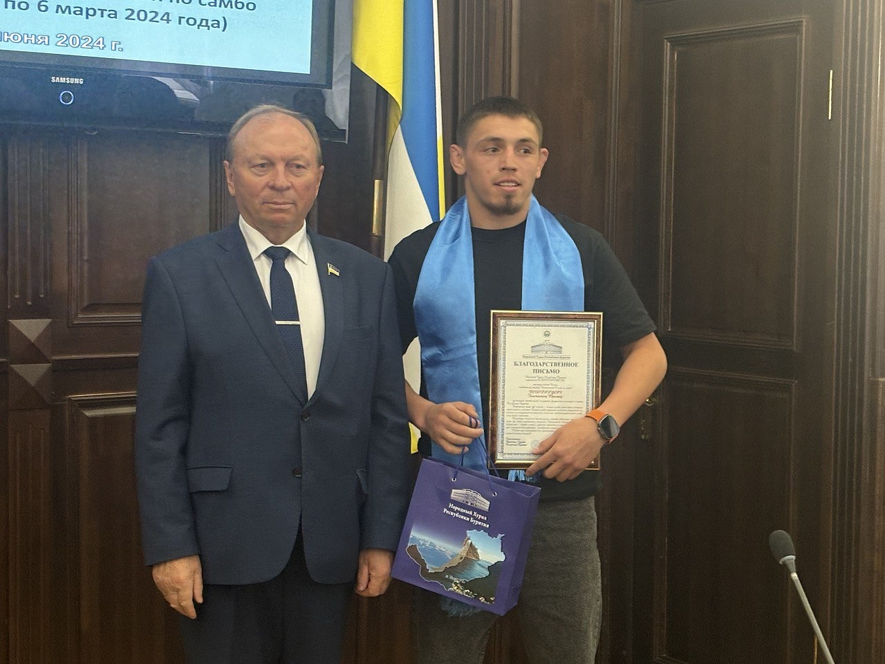 - На ноябрьской сессии мы приняли законопроект о поддержке самбо, где единовременную денежную премию получают спортсмены и тренеры. Закон действует по олимпийским видам, и отдельно приняли по этому виду спорта. Теперь у спортсменов и тренеров есть стимул работать и добиваться еще больших результатов. Надеюсь, традиция чествования спортсменов продолжится и настанет время, когда мы будем поздравлять спортсменов каждую неделю по различным видам спорта. Поздравляем наших героев Алдара и Константина. Мы смотрели поединки, переживали, болели! Наши ребята выступили достойно! - подытожил Виталий Лыгденов.