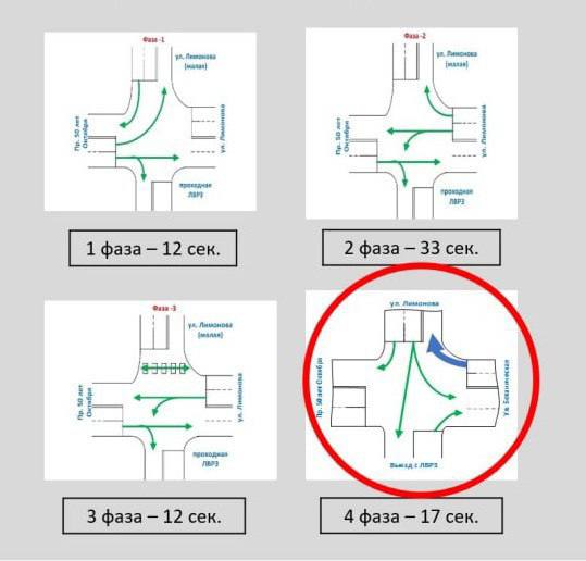 Теперь с ЛВРЗ можно будет выехать только направо, соответствующие дорожные знаки уже установлены. Также изменена работа светофорного объекта на этом перекрестке.