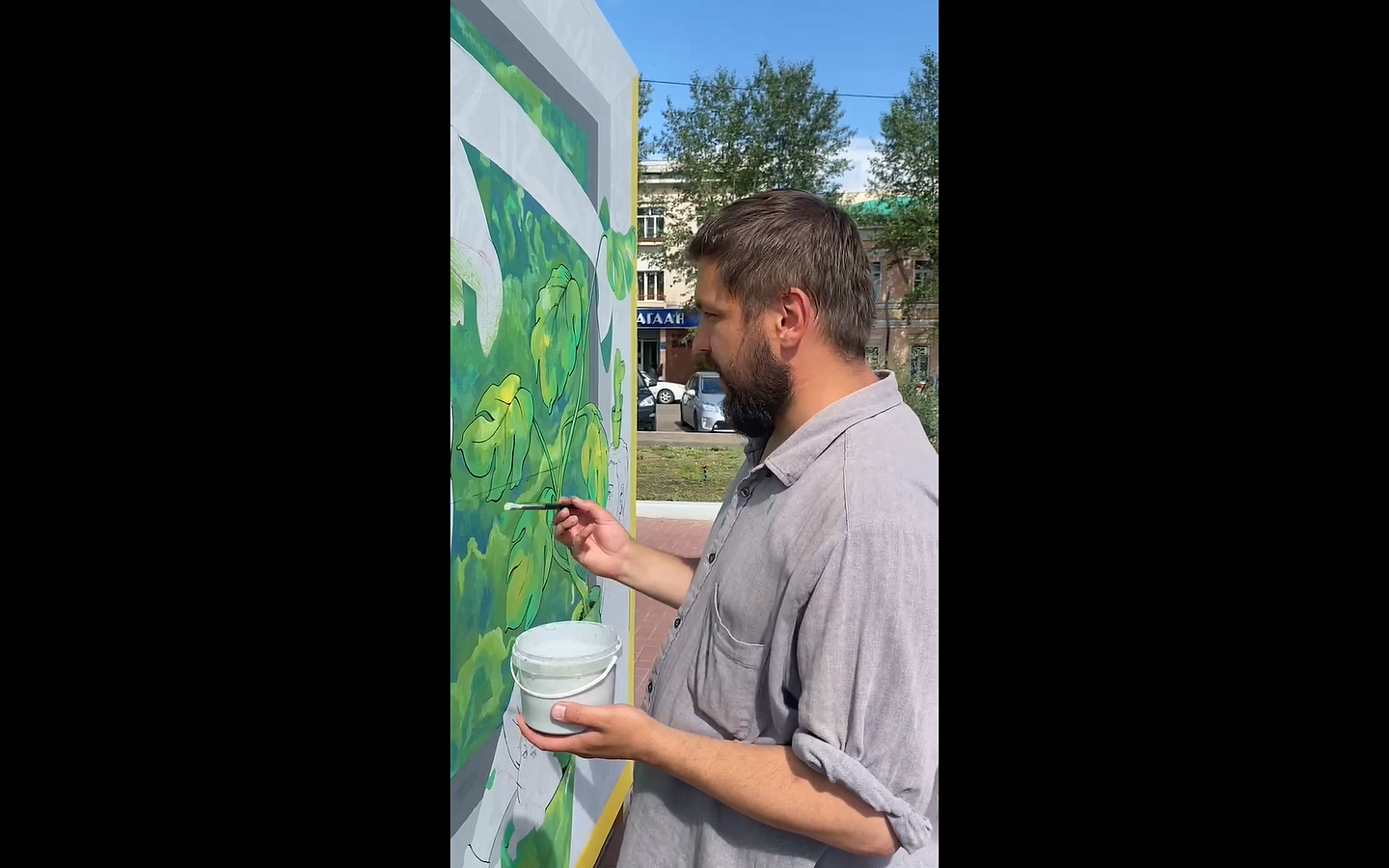 - «Комната в городе» - сама задумка проекта в том, чтобы художники, выразив свое отношение к дому, свои переживания и мысли о доме в такой форме, перенесли бы это ощущение «дома» на окружающую среду. И чтобы люди, которые смотрят на эти объекты, это ощущение поняли – что их дом не заканчивается там, где заканчивается их квартира, - рассказал куратор проекта, художник Артем Маганов. - Я рисую вывернутый дом, у меня несколько сюжетов, которые исключительно мои, домашние – я изображаю условно себя, свою дочь и жену в домашней атмосфере. При этом немного «сюра» добавляю.