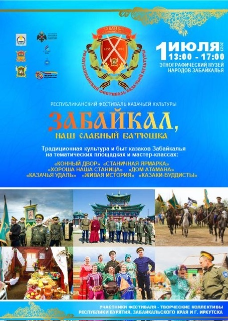 В Улан-Удэ 1 июля состоится Республиканский фестиваль казачьей культуры «Забайкал, наш славный батюшка» (0+) на территории Этнографического музея народов Забайкалья.