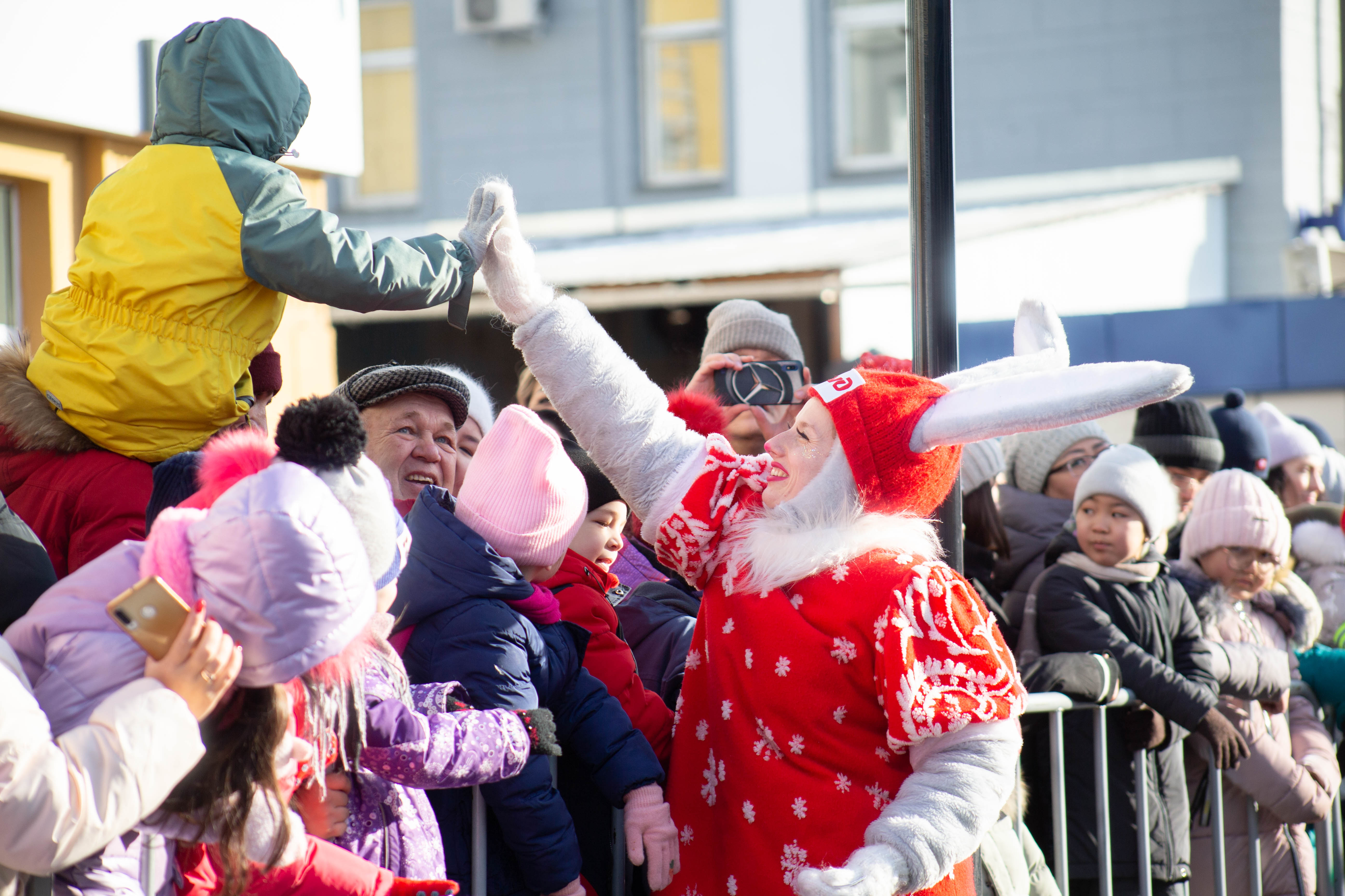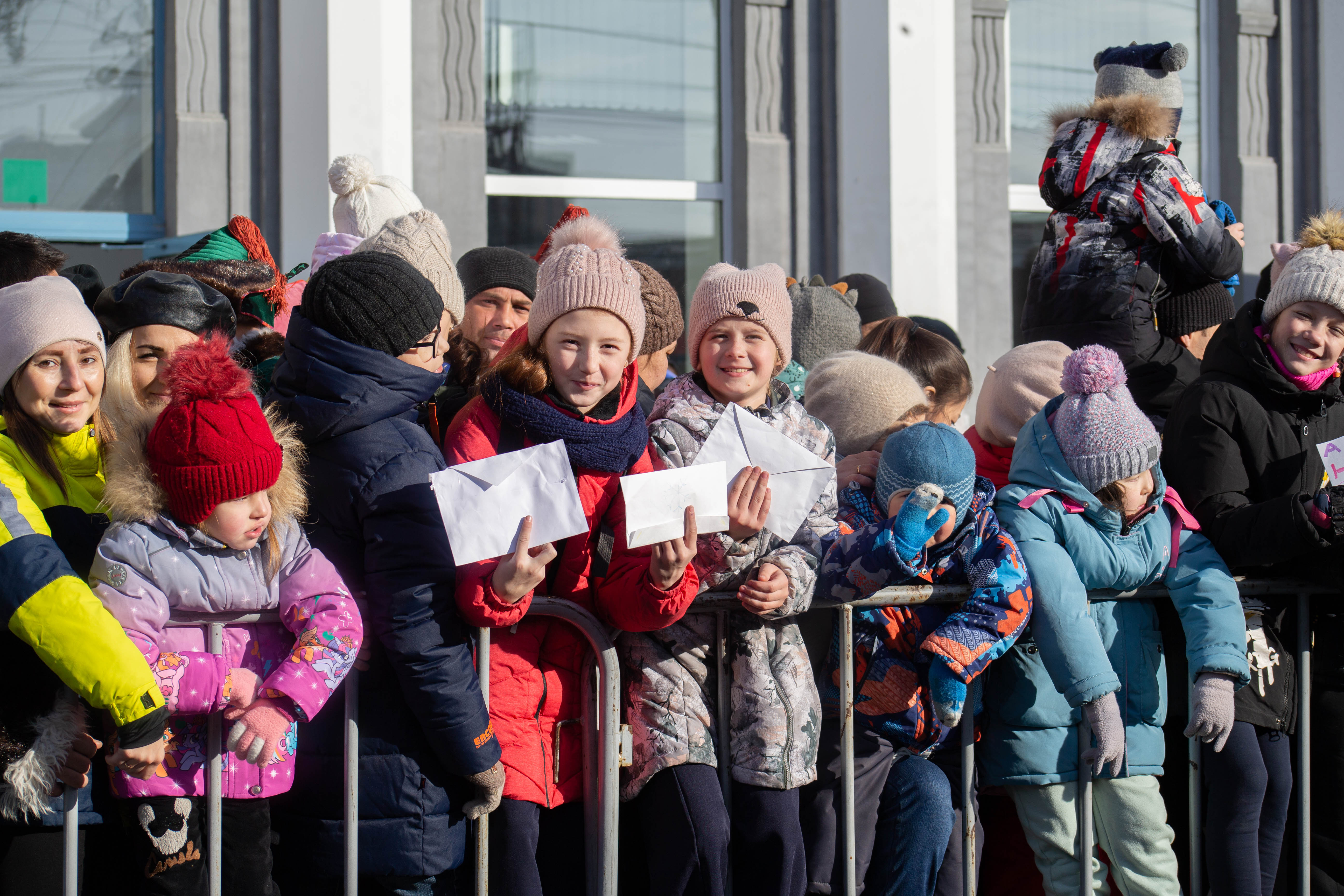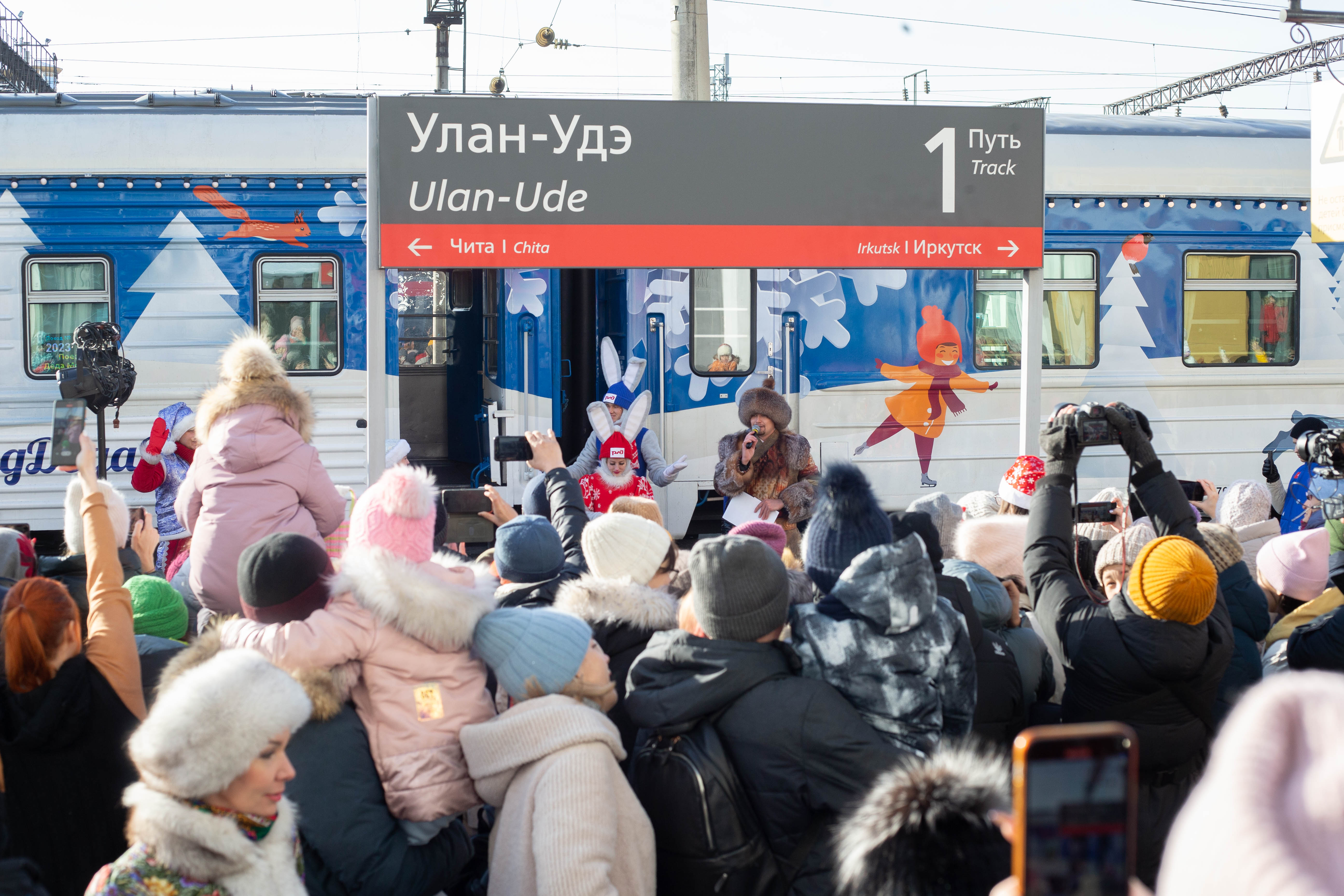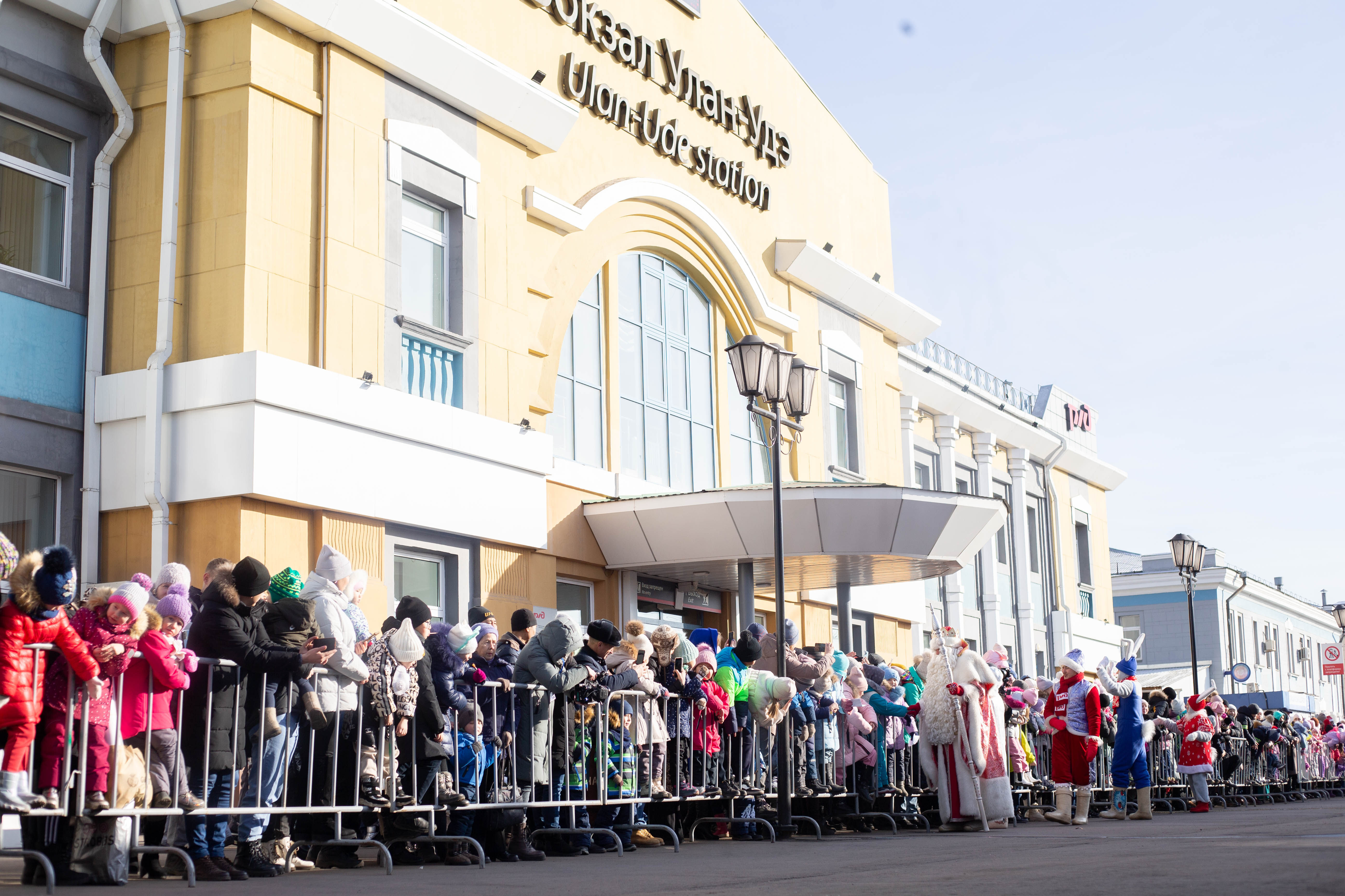 Началось с того, что гудок паровоза перекрыл восторженные голоса детей и их родителей. Несмолкаемой радостью встречают всех героев выходящих из поезда. Прекрасная команда зайчиков начала свое представление. Вместе со Снегурочкой дети звали деда Мороза. Так же пришел встретить детей и гостей из Великого Устюга наш Сагаан Убгэн.